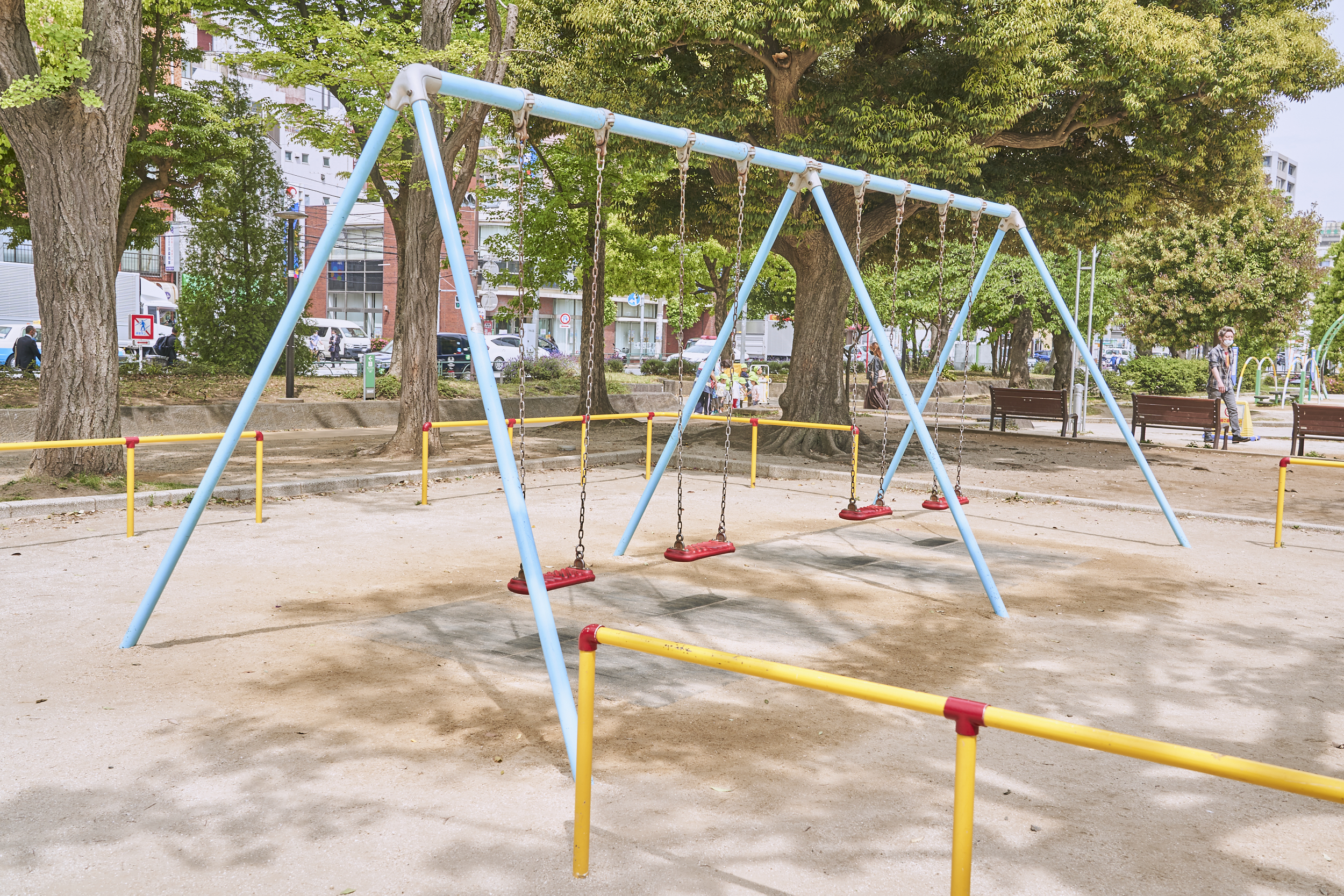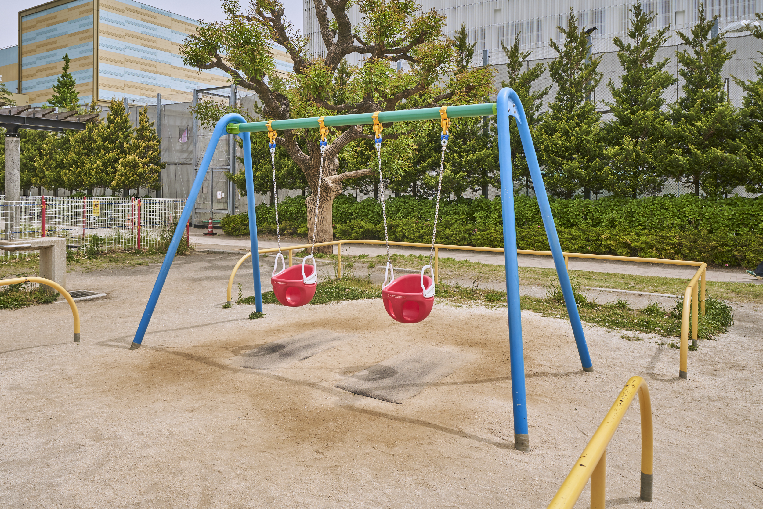 ブランコは4つあるので、順番がまわってくるのがスムーズ! 3歳以下の小さな子には、低年齢向けエリア「ちびっこ広場」にある、かご型ブランコが安全でおすすめです。