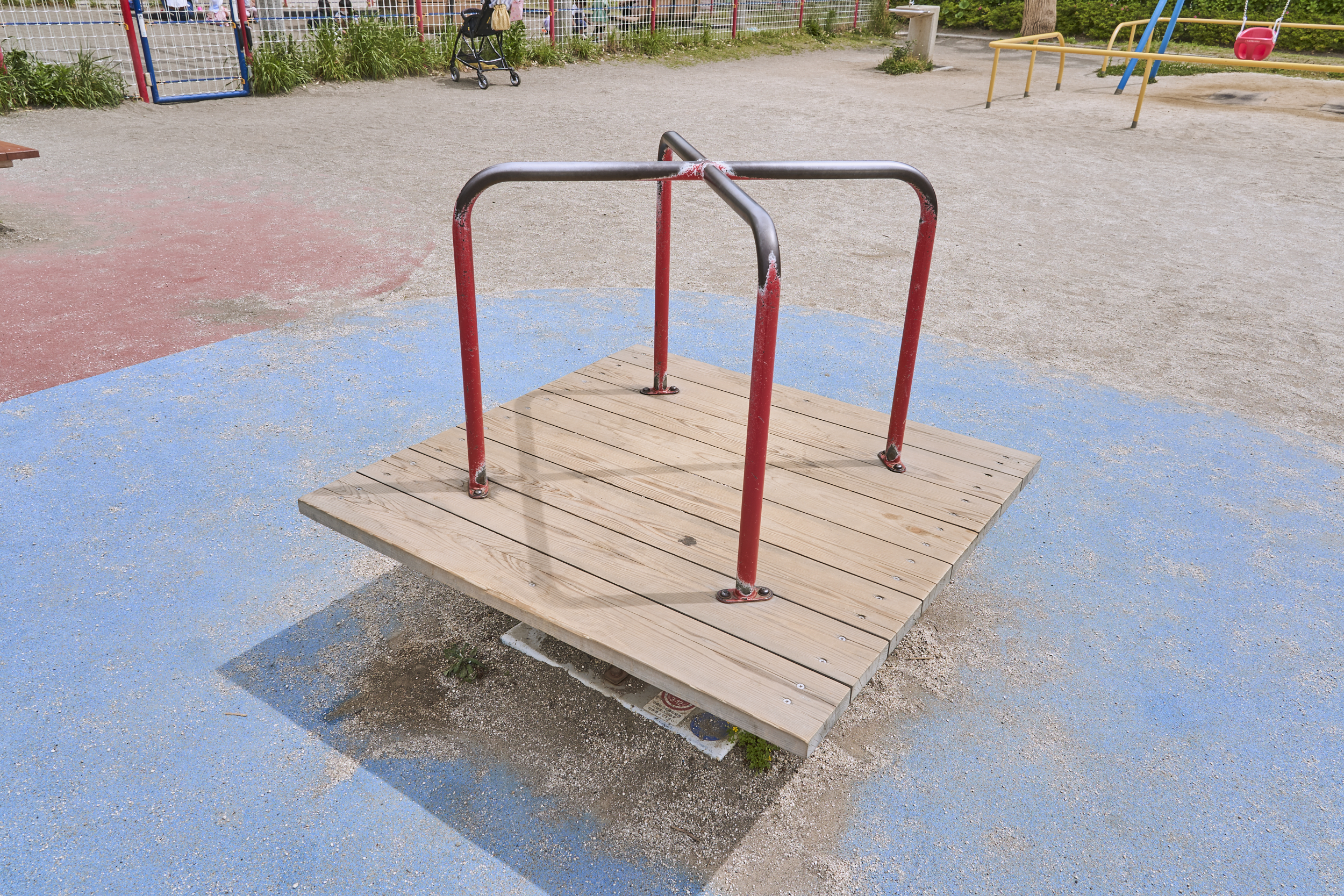こちらは、低年齢向け複合遊具の近くにあるバネの遊具。上に乗って鉄棒を掴みながらぴょんぴょんとジャンプして遊びます。