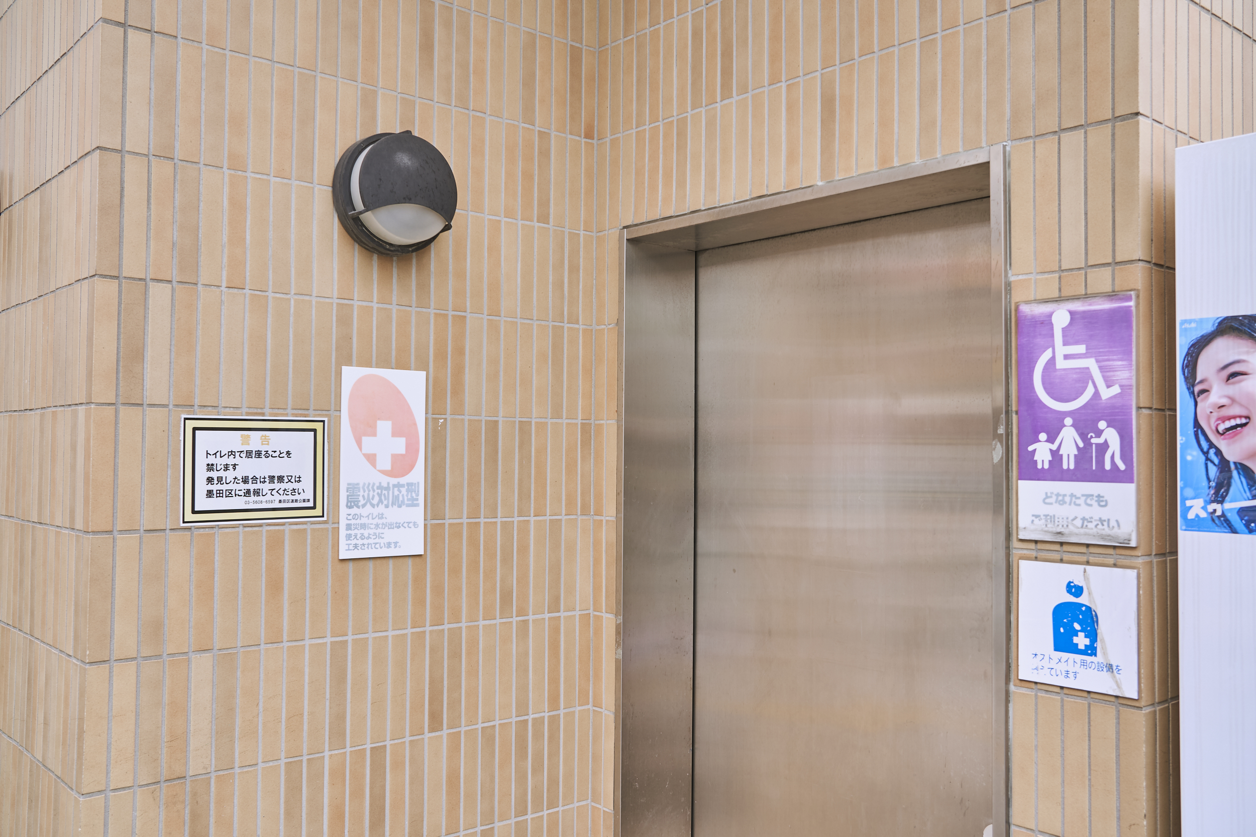 おむつ替えのベビーシートが備え付けられた、だれでもトイレ。男女共用で1室のみの設置となります。