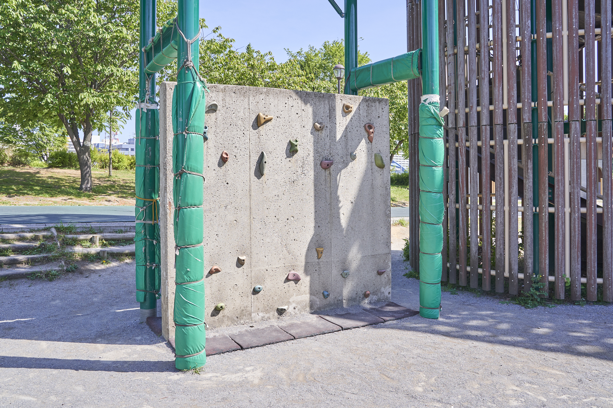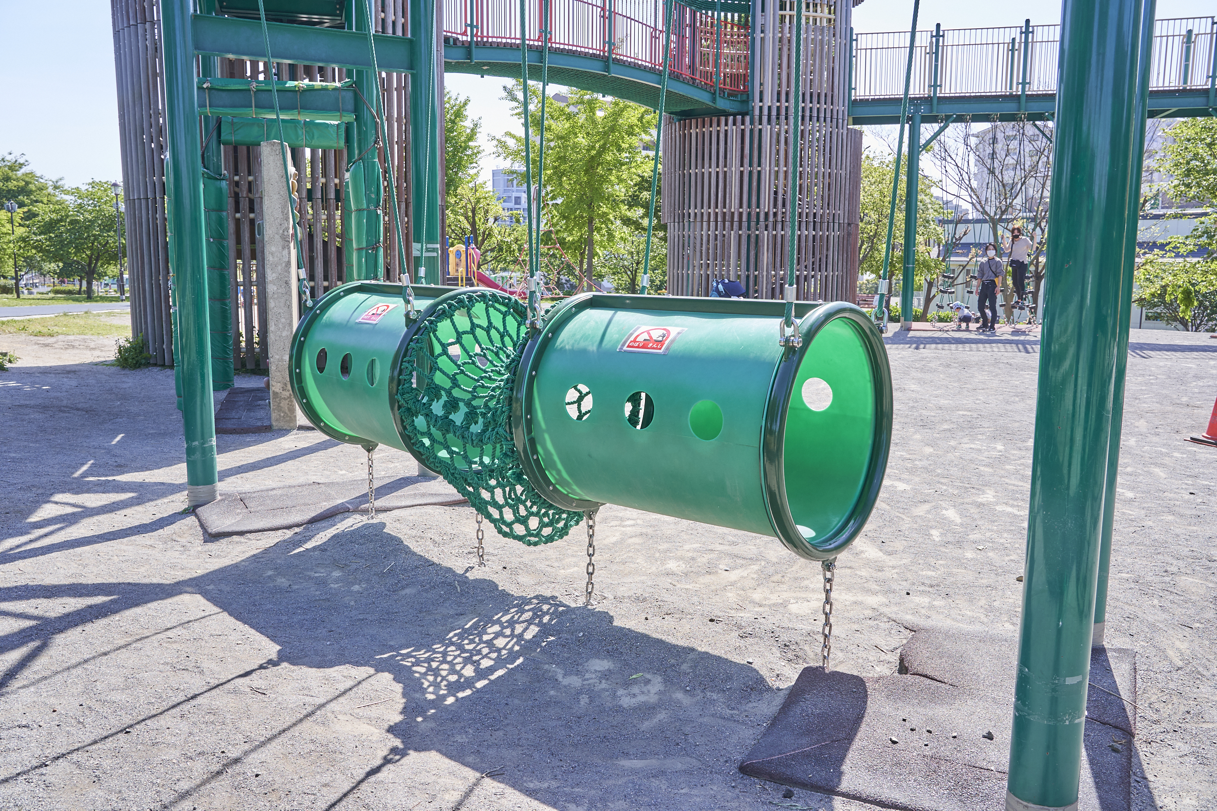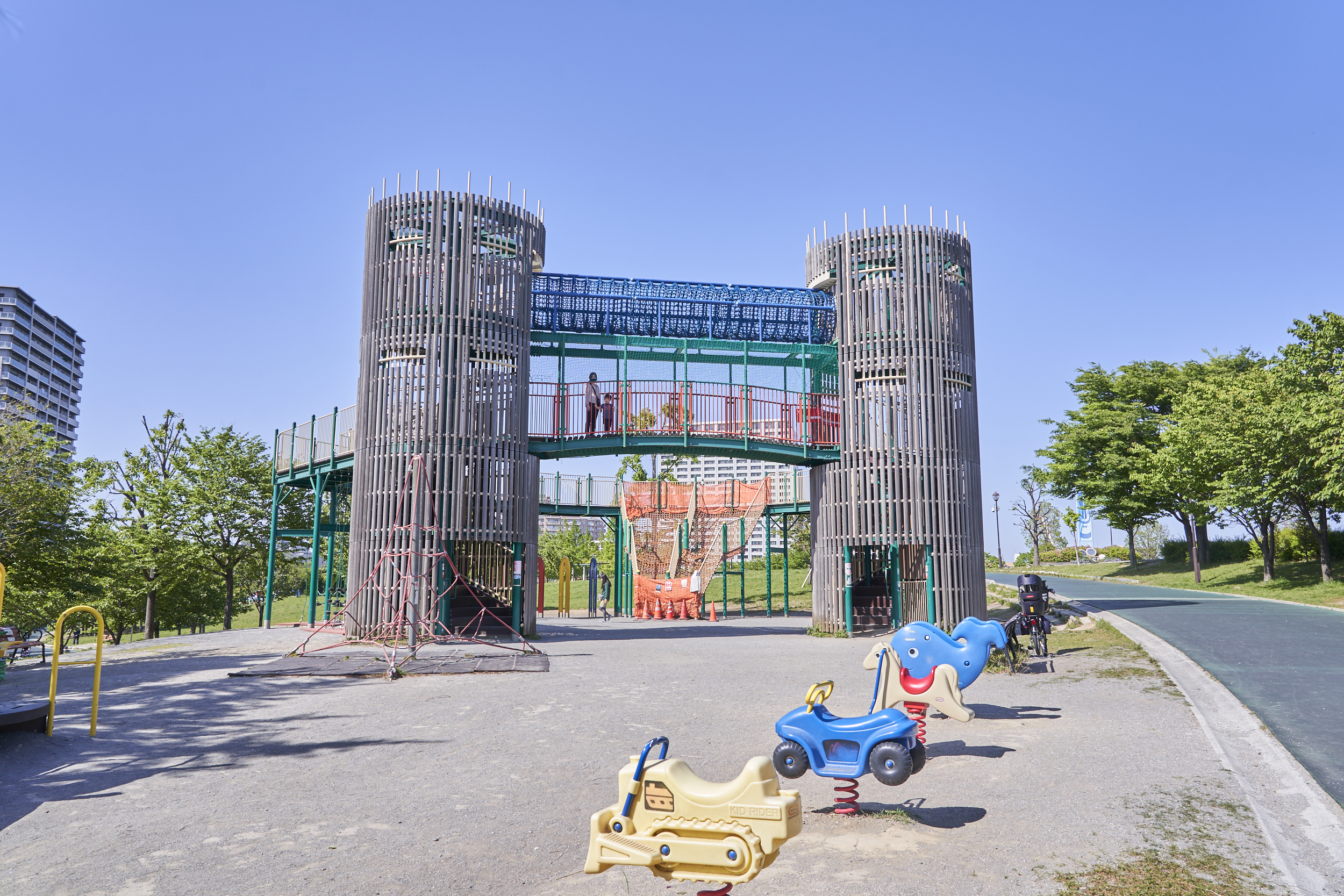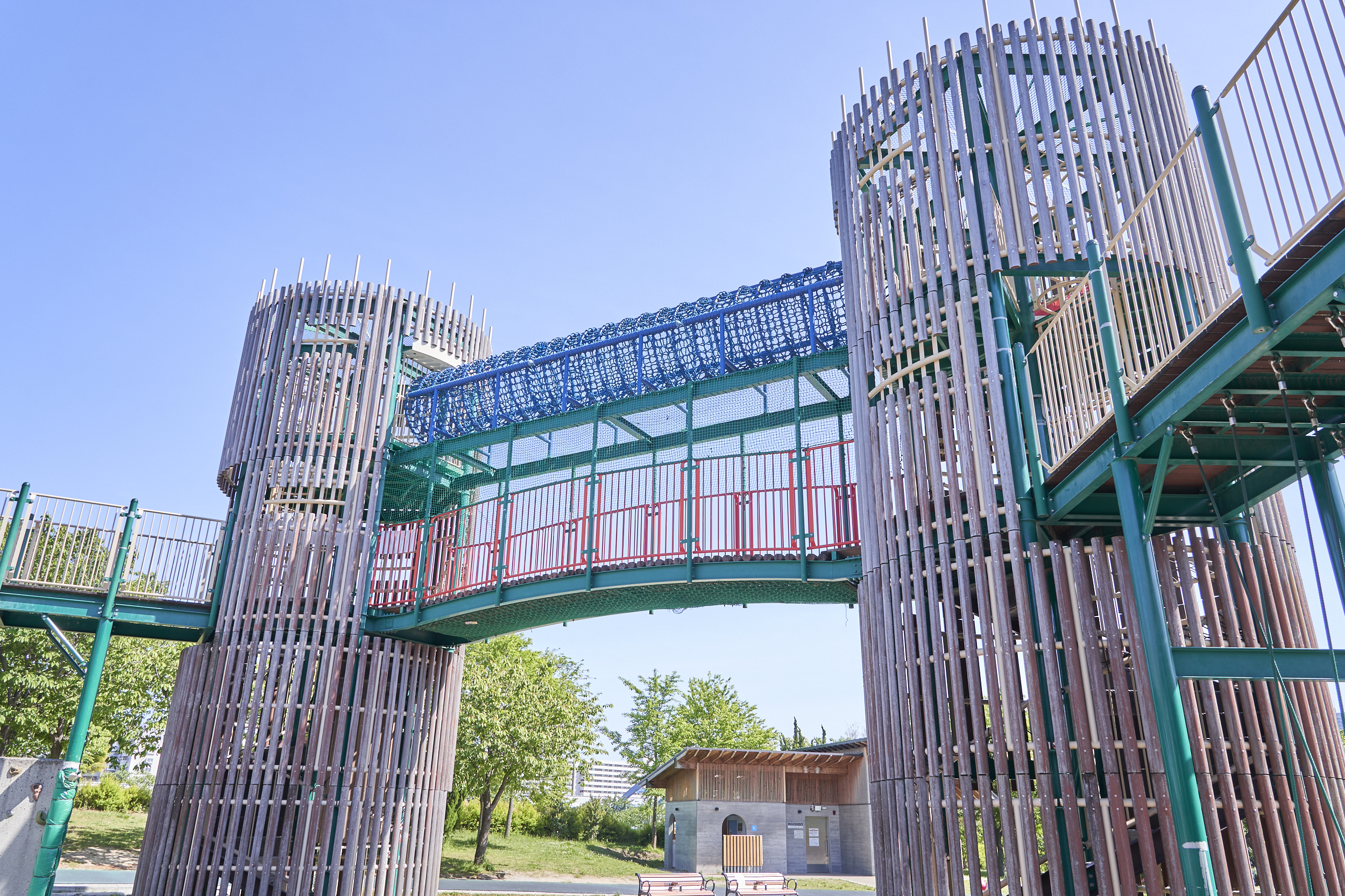 見た目のインパクトでも子どもの心を引きつける通称「ツインタワー」。空中回廊の下に渡り遊具やボルダリング、トンネル滑り台などバラエティーに富んだ遊具が並んでいます。