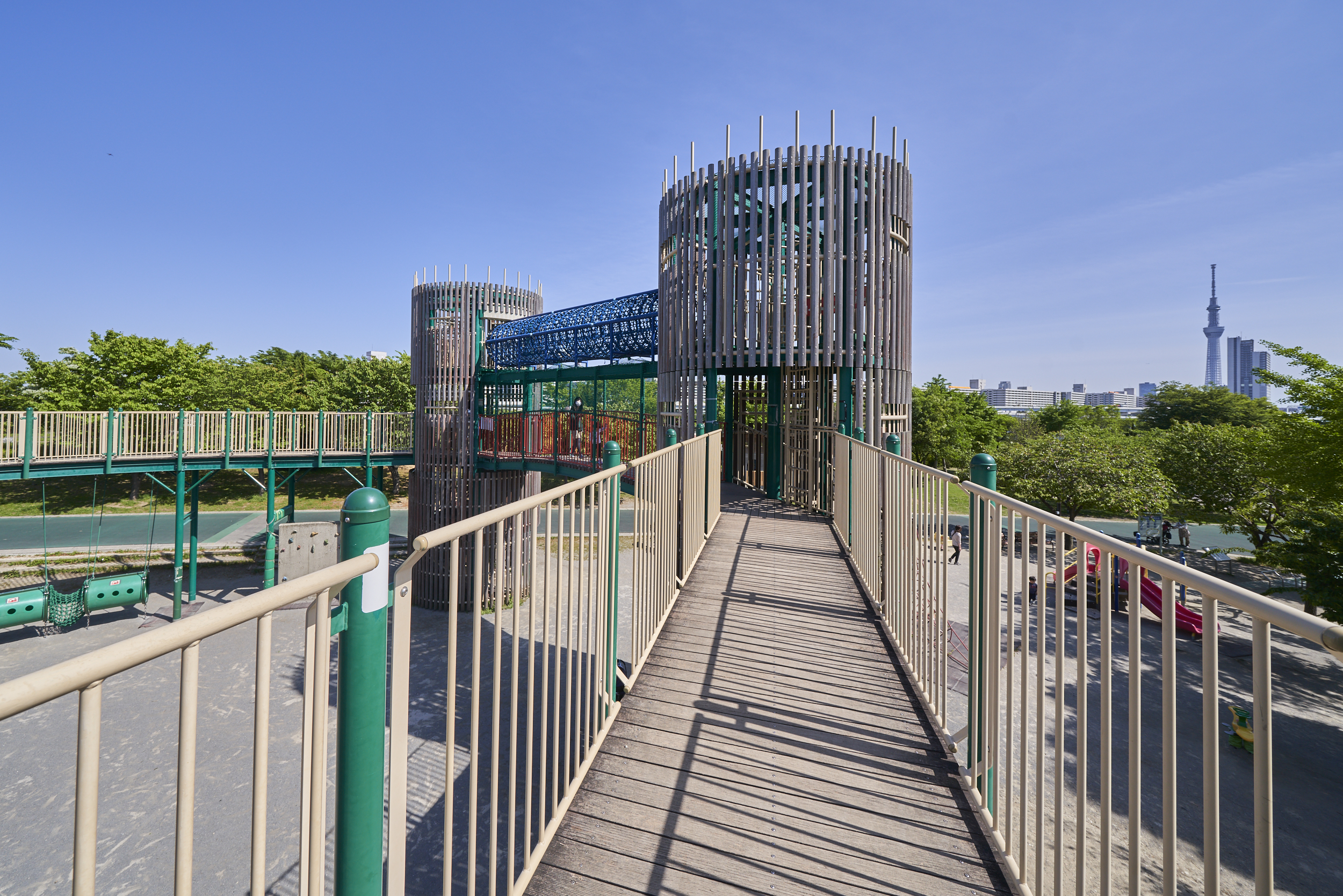 まずは遊具と「芝生広場」がある公園の北側へ。名物遊具「ツインタワー」に挑戦! さまざまな遊具が組み込まれているので、めいっぱい体を使って楽しんで。小さい子どもには、付近にある幼児用遊具もおすすめです。遊具が満喫できたら、「展望広場」で隅田川とスカイツリーを眺めたり、芝生でピクニックをしてエネルギーをチャージ。さらに、芝生を走り回ったり、川沿いを散歩したり、噴水で水遊びしたり……楽しみは尽きません。1日たっぷり遊びましょう!