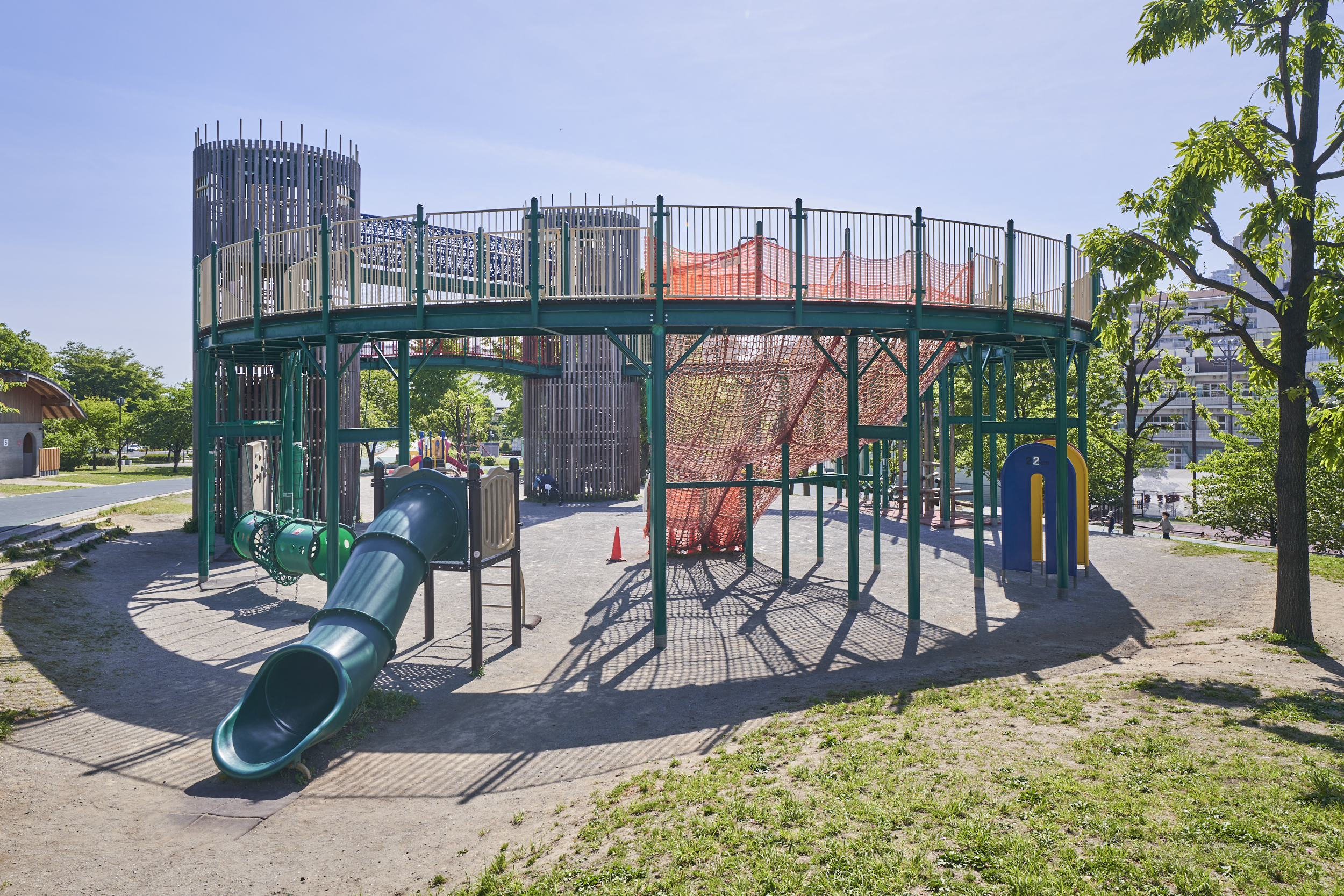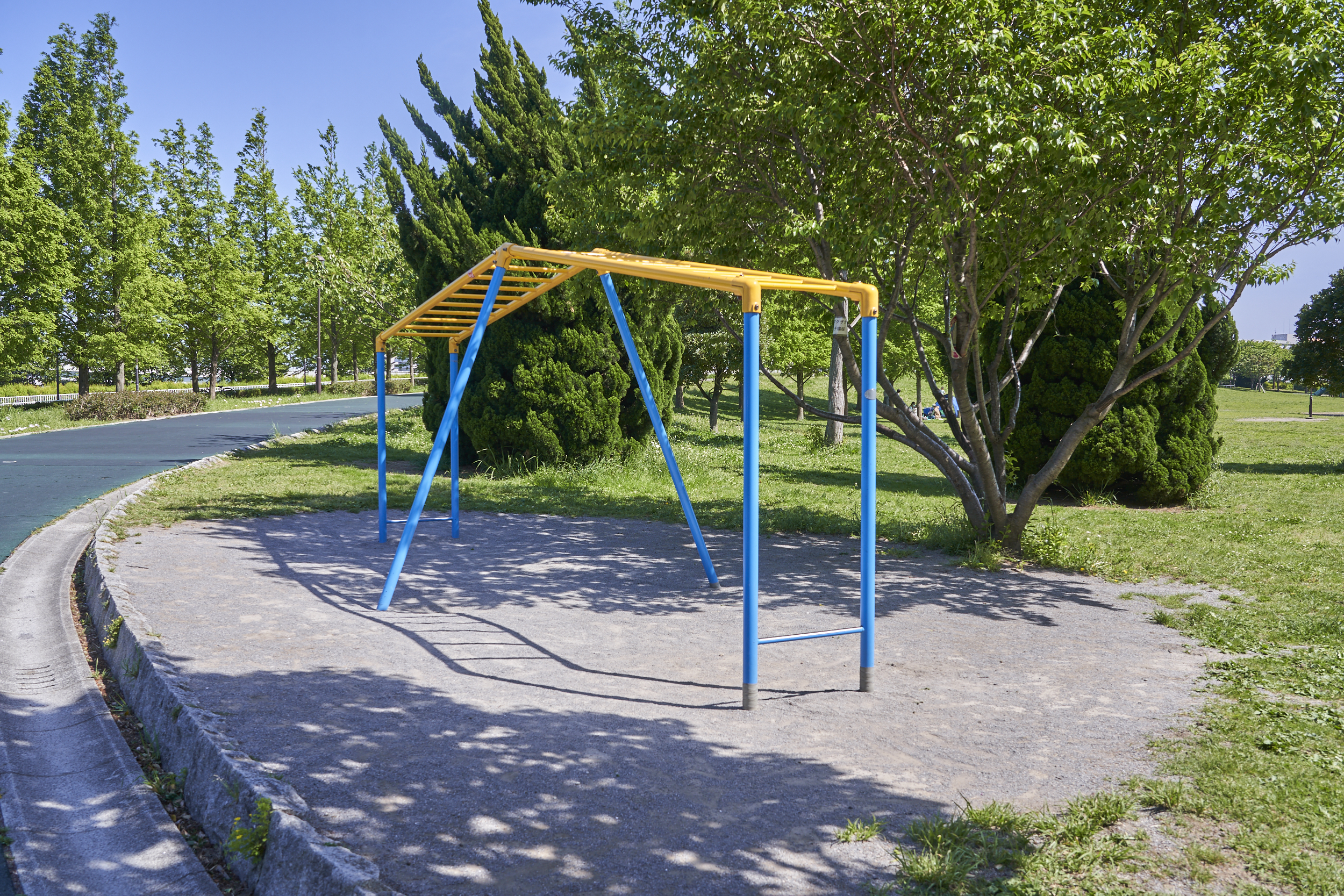 汐入公園で人気の「ツインタワー」と呼ばれる複合遊具は、たくさんの遊具で構成されています。これひとつで多くの基本動作ができるので、組み込まれた全遊具の制覇にチャレンジを! 遊具広場の隣にある「芝生広場」は、ゆるやかな傾斜があるので、駆け回って遊べば上り下りの運動にも。広大な敷地に魅力的なスポットが点在しているので、園内を歩き回って、クタクタになるまで遊びましょう。