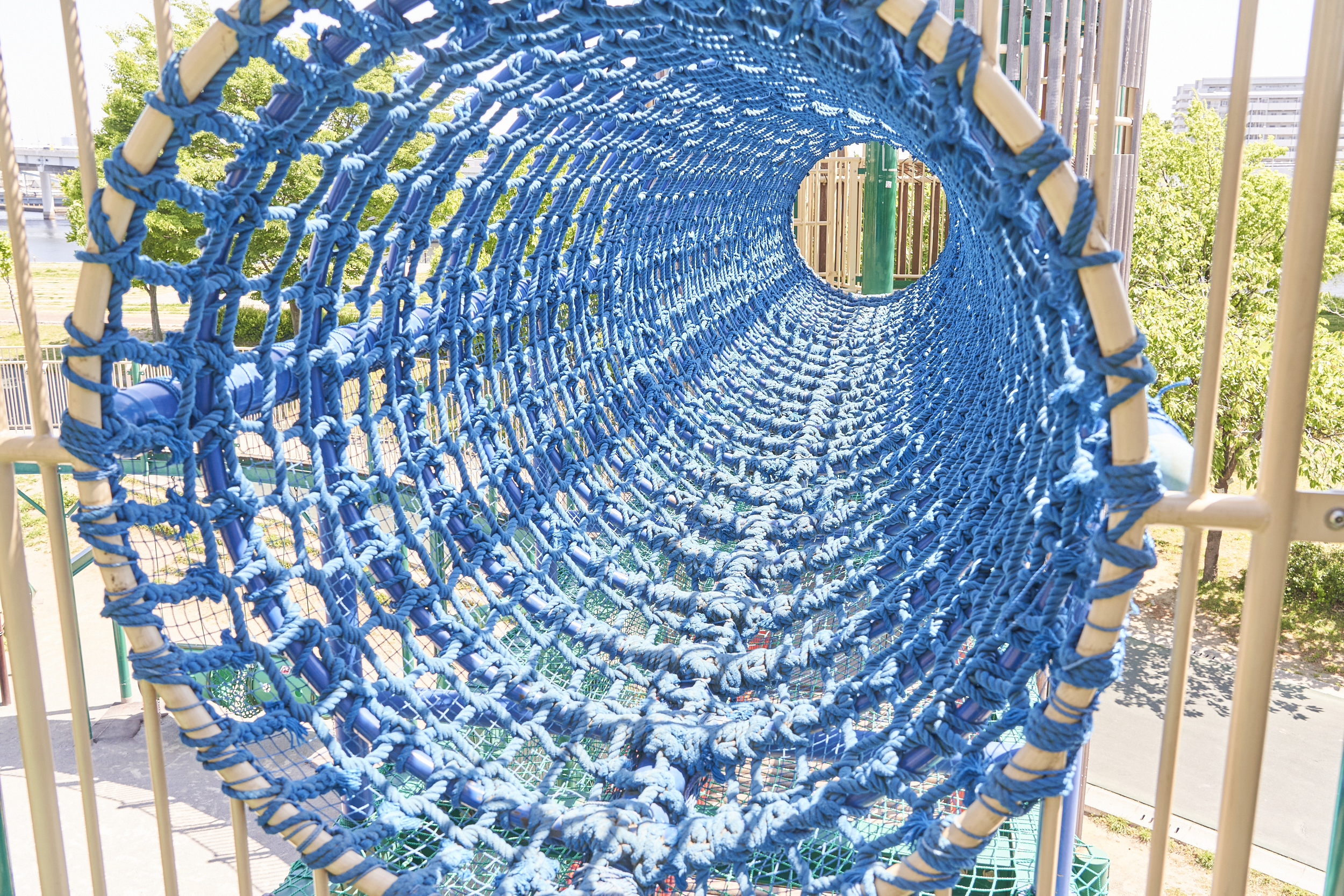 ロープで吊り下げられたユラユラゆれるトンネル。真ん中のネットの部分をくぐり抜けられるかな?