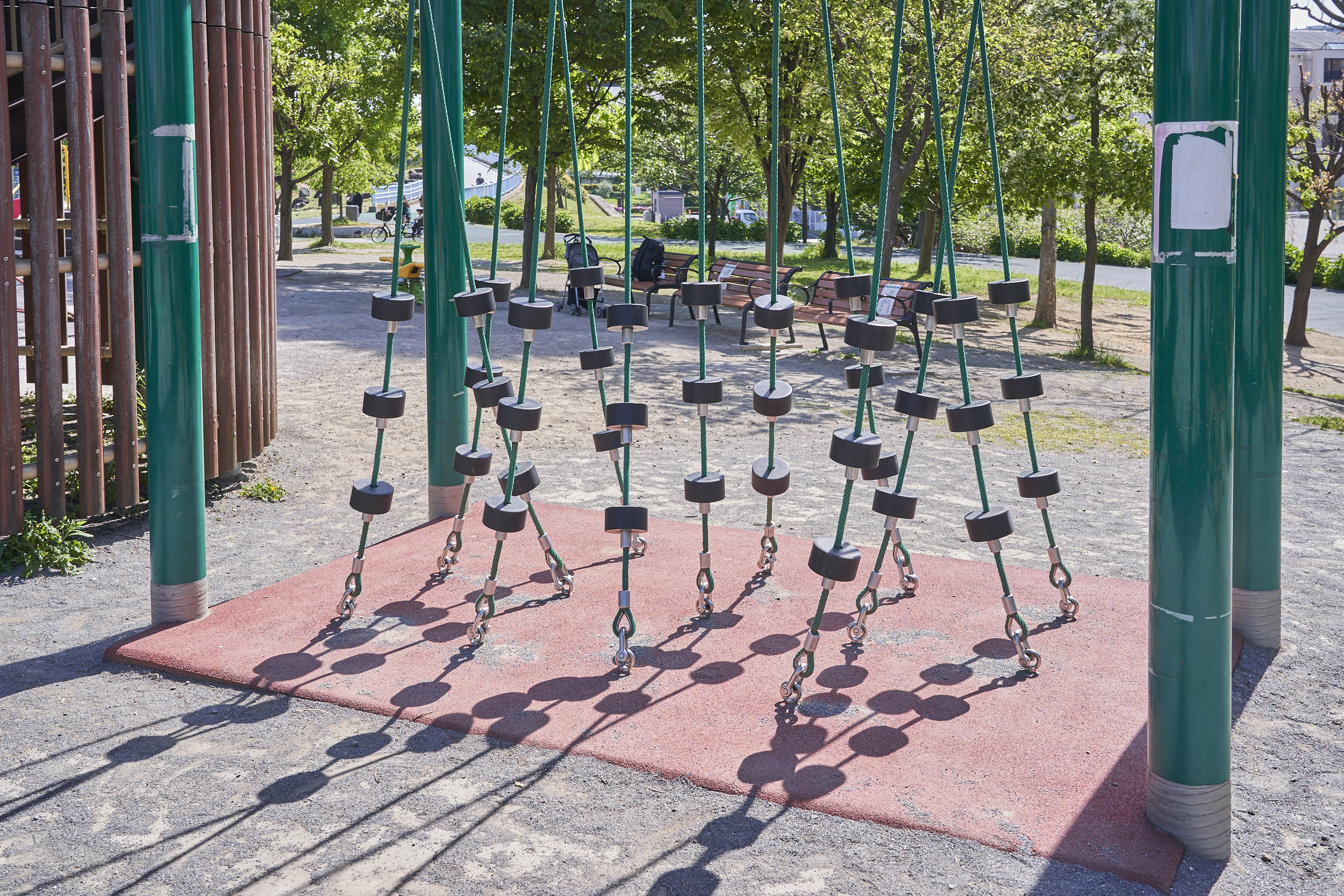 広場の周囲には10種類の健康遊具が設置されています。うんていなど、親子でチャレンジできそうなものもありますよ。大人サイズの高さなので、子どもが挑戦するときはサポートしてあげてください。