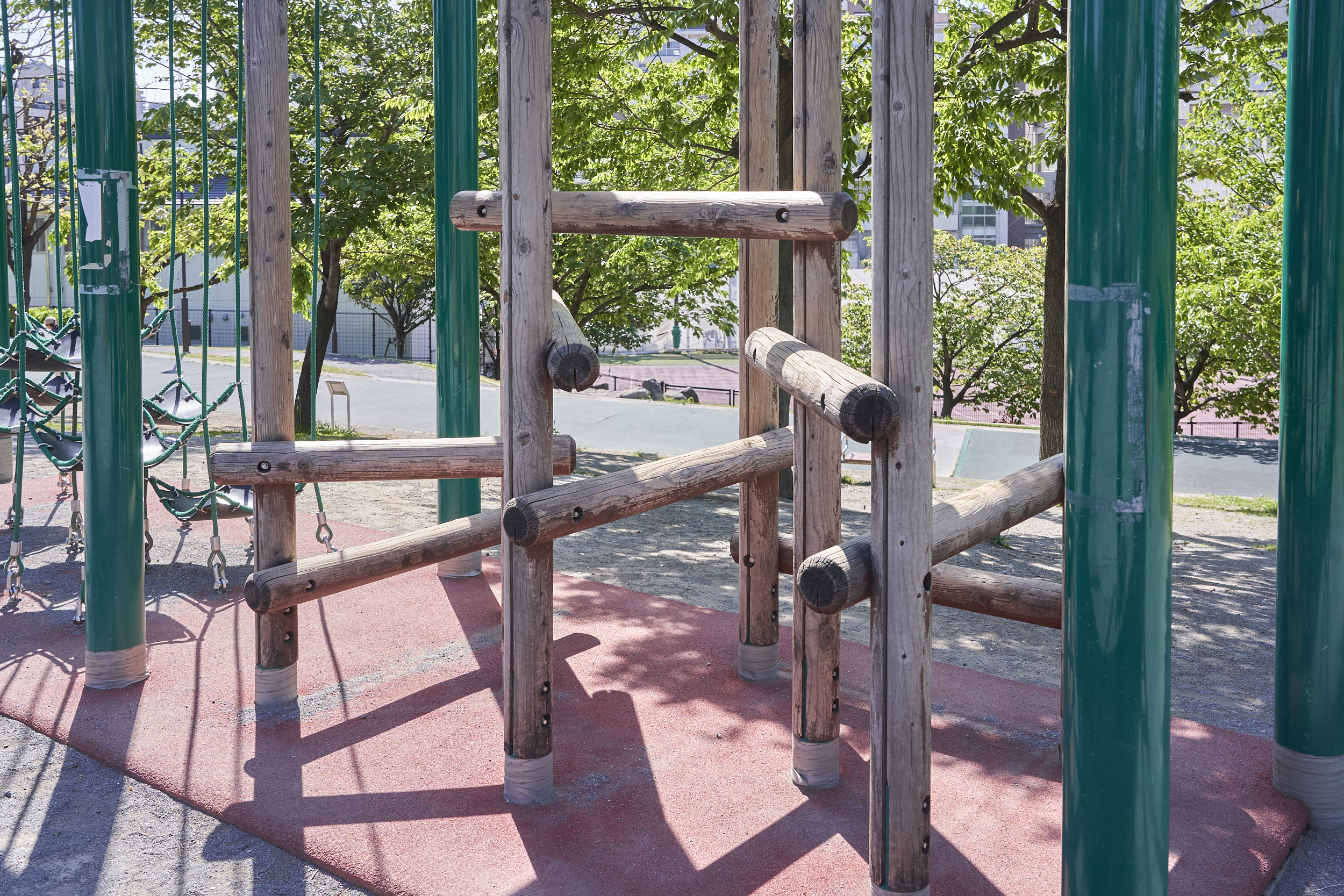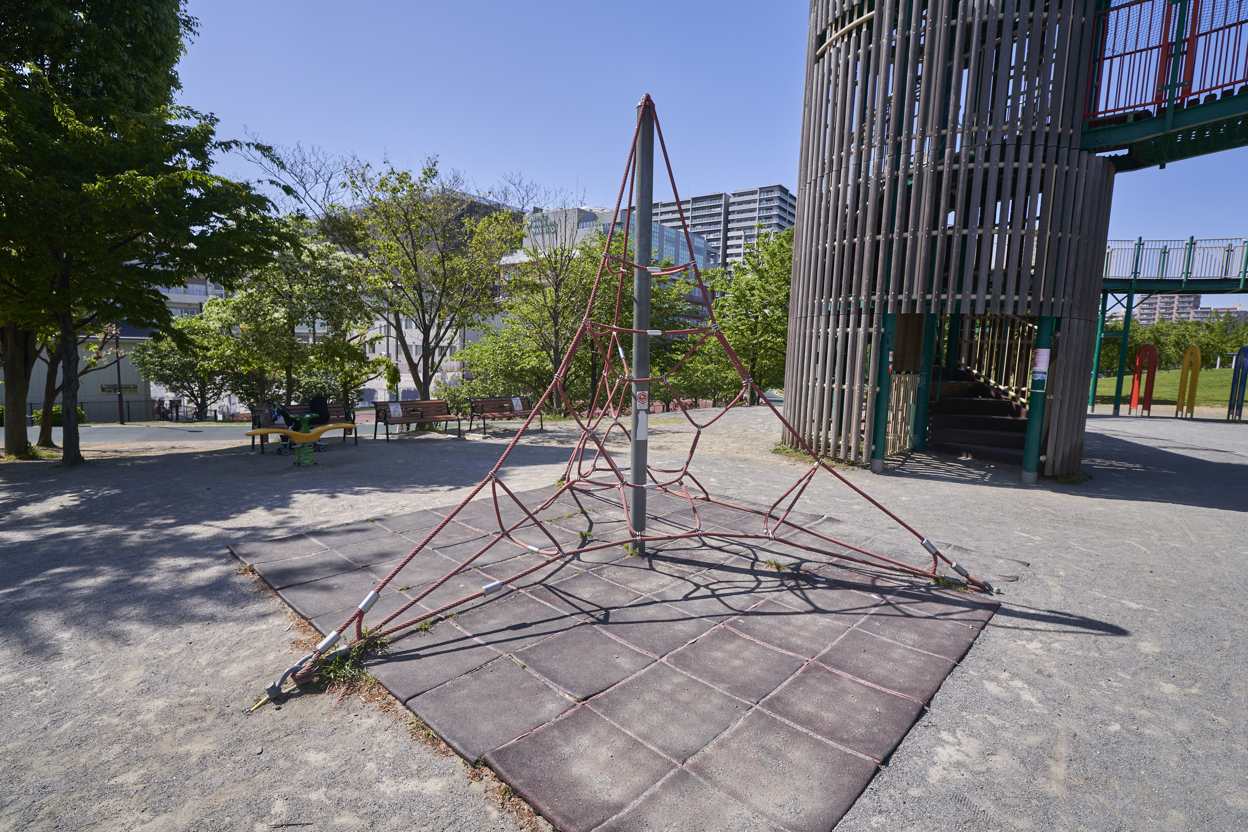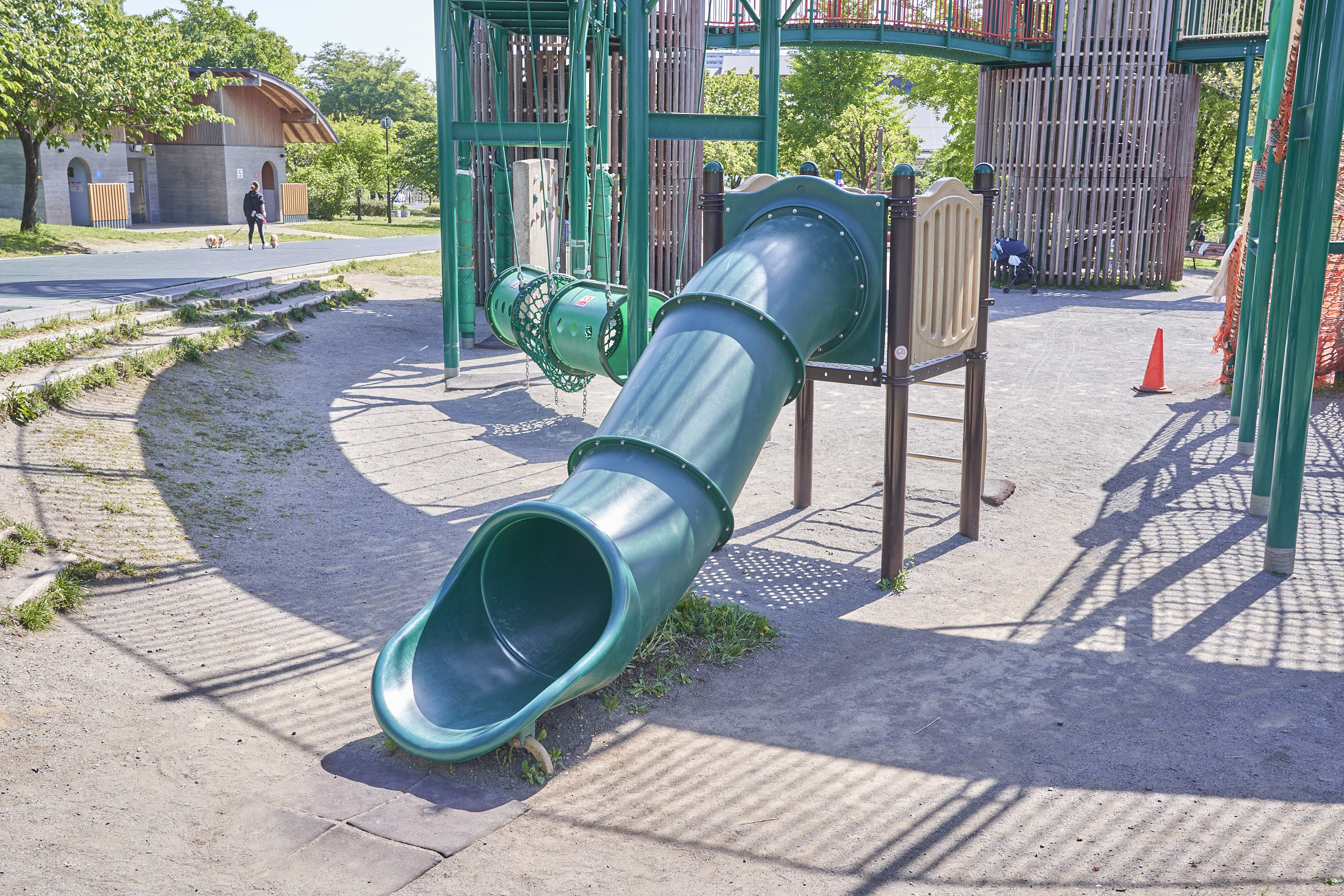「ツインタワー」の横には広々とした「芝生広場」があります。全体的にゆるやかな傾斜がついているので、鬼ごっこなど空間を大きく使った遊びをすると、自然に上り下りの運動に。芝生の感触を楽しみながらゴロゴロ休憩するのもおすすめです。日当たりがいいので、テントなど日除けになるものがあると過ごしやすいかもしれません。