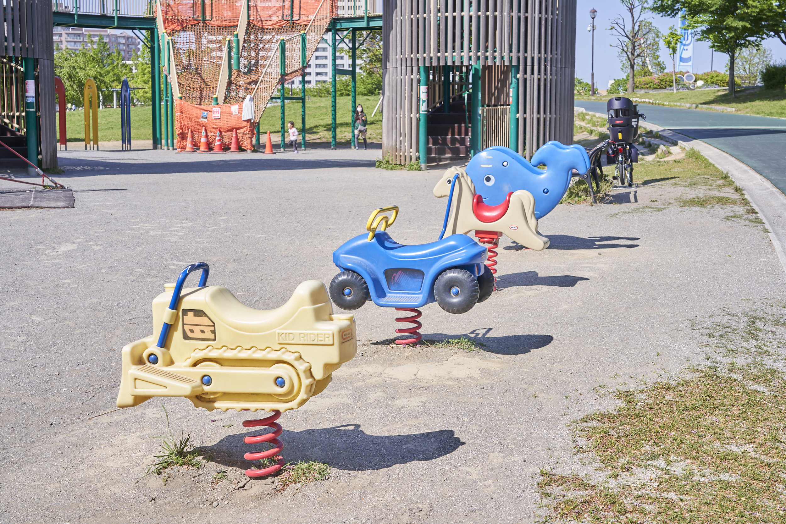 上下にゆらして遊ぶスプリング遊具は、ブルドーザー、バイク、馬、クジラの4種類。全部乗ってみたくなりそう。