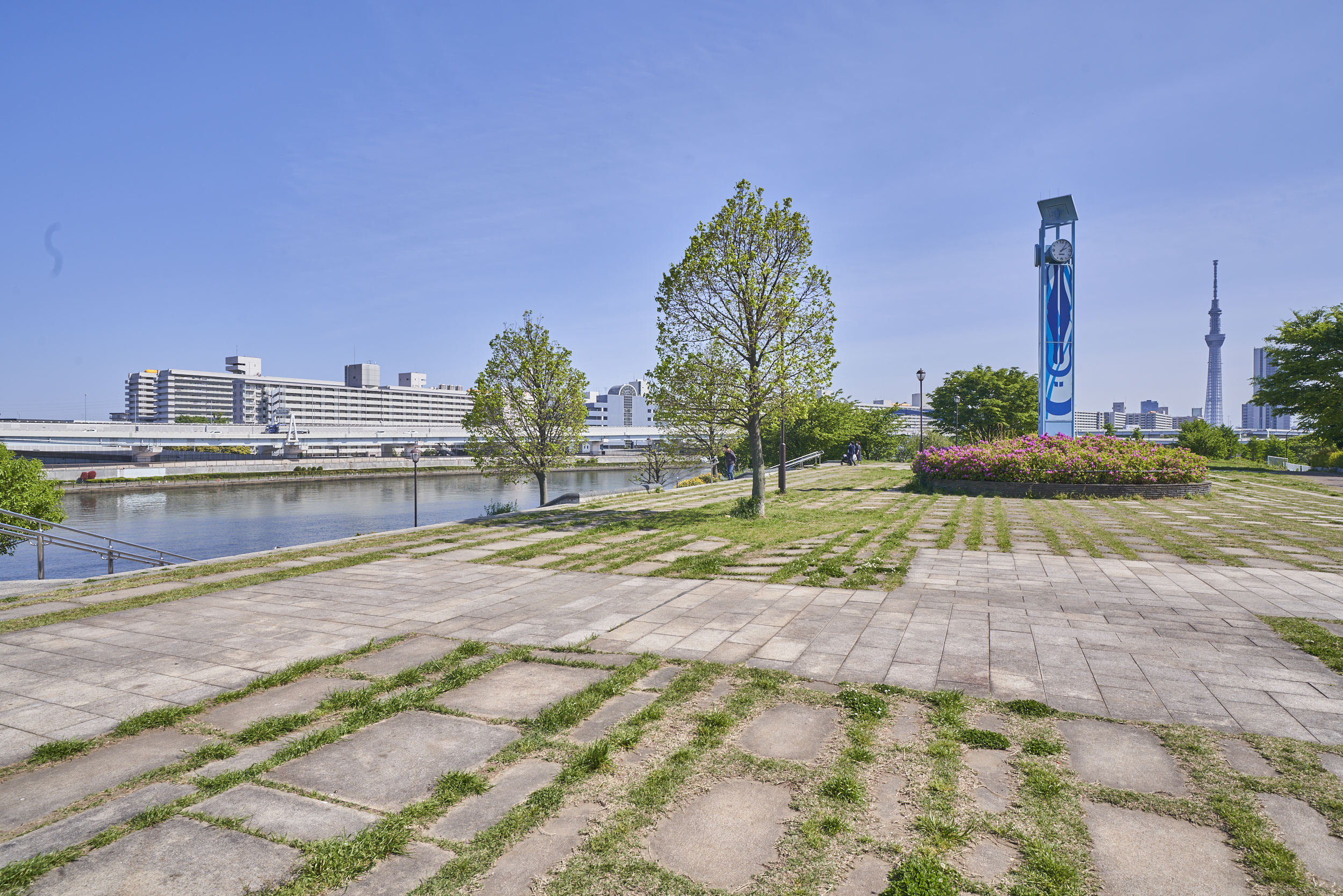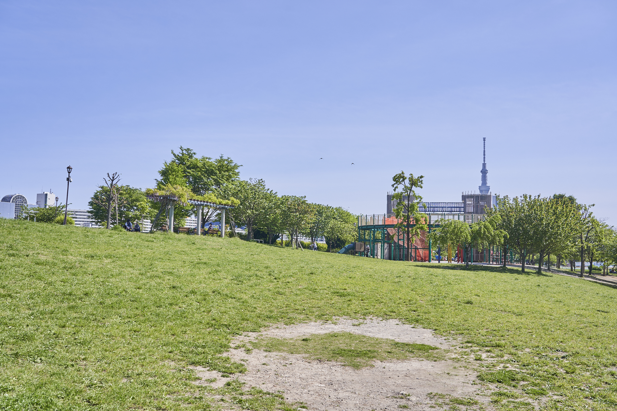 視界を遮るものがなく、スカイツリーを眺めながら開放感に浸れます。隅田川に向かってゆるやかな上り坂になっているので、広い空間を走り回れば足腰が強くなりそう。