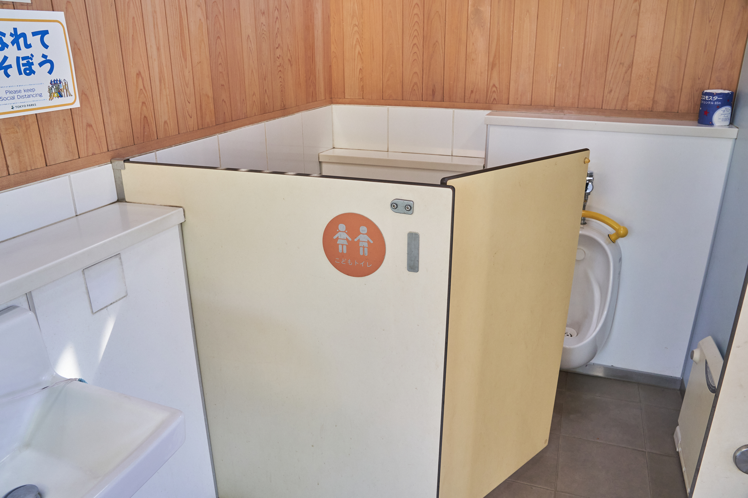 さらに、男子トイレ・女子トイレそれぞれに「こどもトイレ」が設けられています。外から見守ることもできる低い仕切りで区切られた半個室に、幼児用便器、男児用小便器のほか、着替えに使えるボードもあり、行き届いた配慮が嬉しいです。