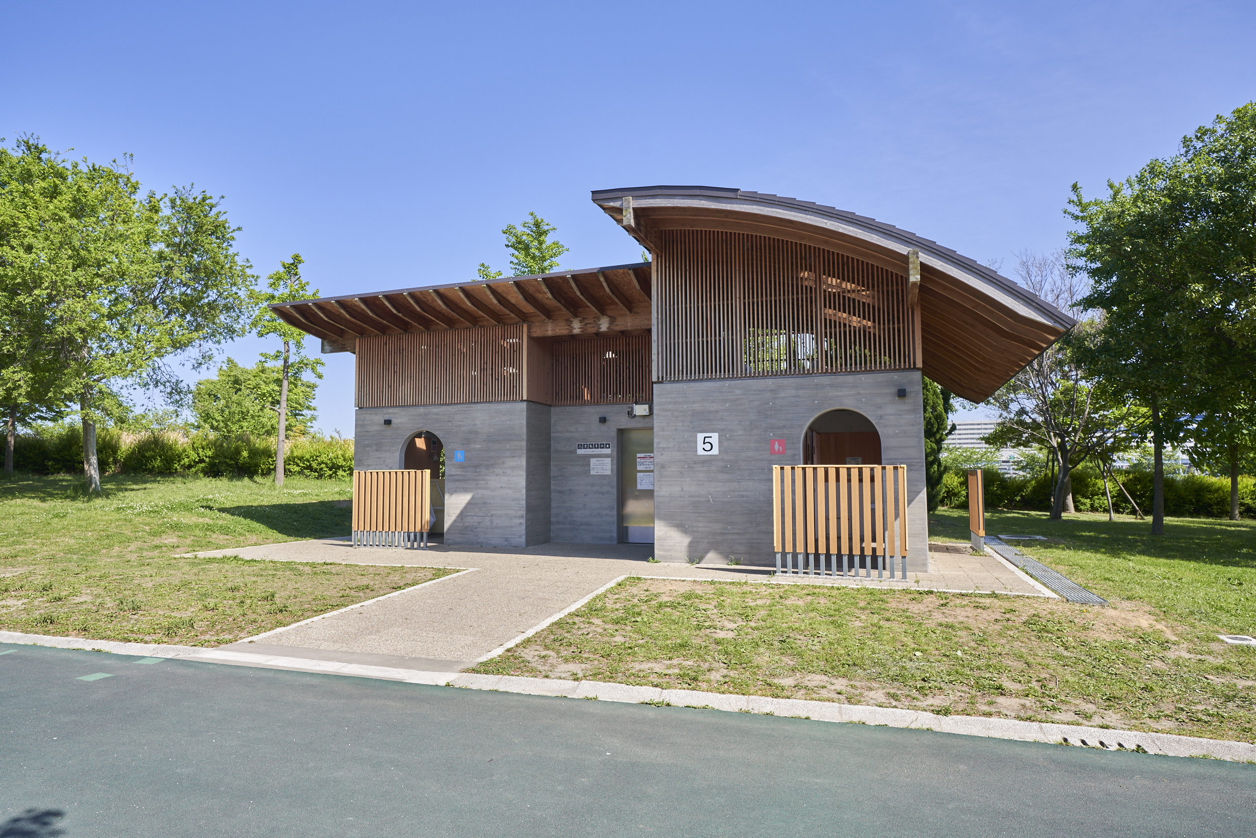 トイレは公園内に6カ所、各スポットの近くに配置されているので安心です。おむつ交換台を備えただれでもトイレは5カ所にあります。特に、遊具広場の横にあるトイレは子どものための設備が充実。だれでもトイレには、手すり付きの幼児用便器もあります。