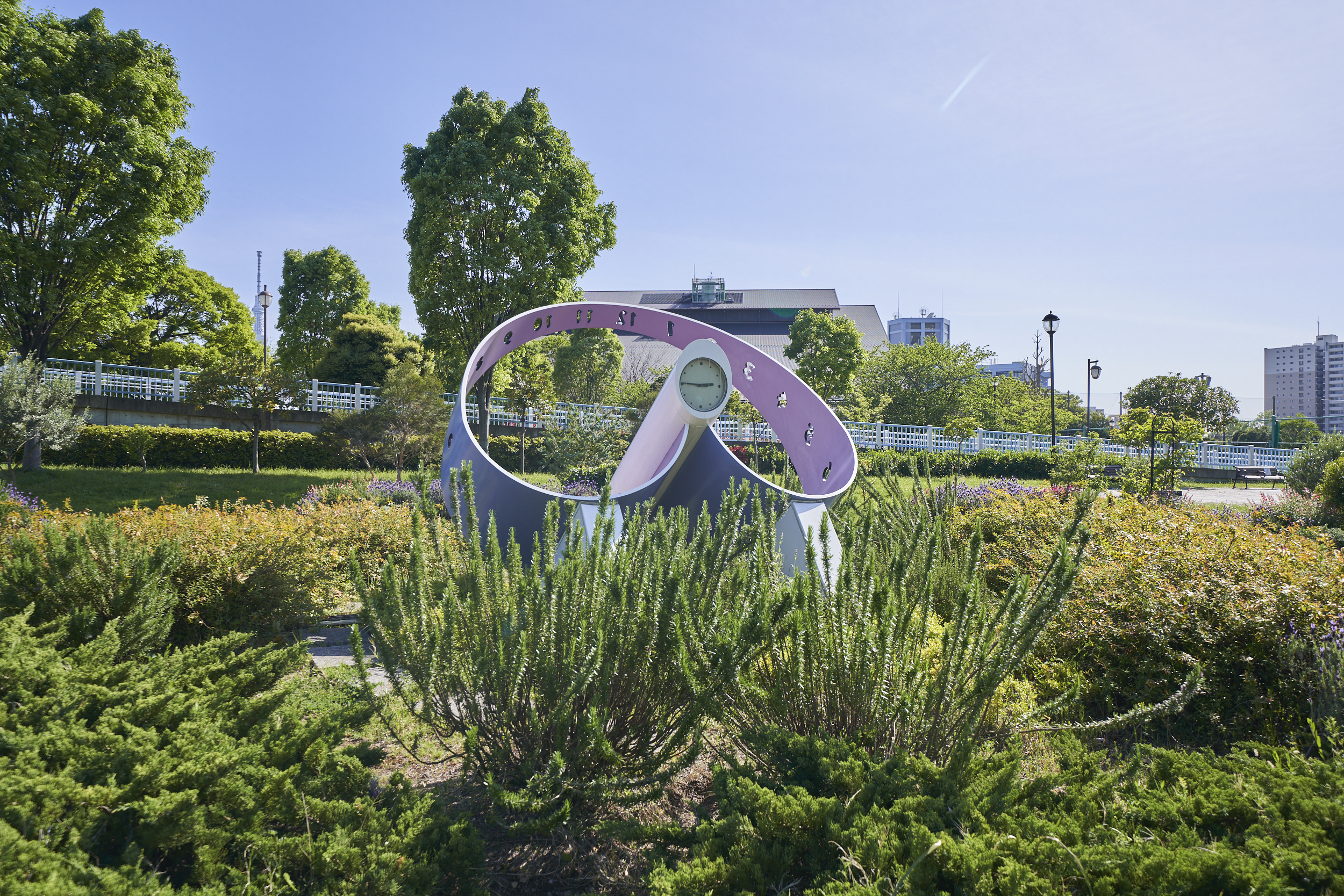 荒川区の東端に位置する汐入公園は、隅田川沿いにあり、水辺の心地よさを感じる公園です。眺望が開けた園内は開放感にあふれ、至るところからスカイツリーを眺めることができます。子どもに人気の巨大複合遊具や広々した芝生の広場のほか、日時計があるハーブガーデン、噴水、テニスコートやグラウンドなどのスポーツ施設、バーベキュー広場など、充実した施設をもち、子ども連れのファミリーをはじめ、幅広い世代に親しまれています。