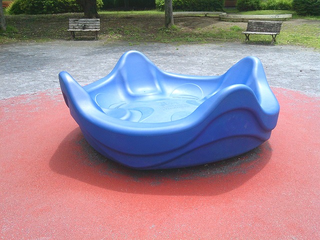 支柱を軸にして回転する遊具。台に乗って体重移動で回すこともできますし、支柱を手にもって回りを走り、勢いがついたらぶらさがるという高度な技も!