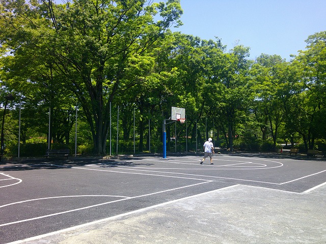 大人用の健康器具が揃う広場。一角にはバスケットボールのゴールとハーフコートが2つ並んでいます。