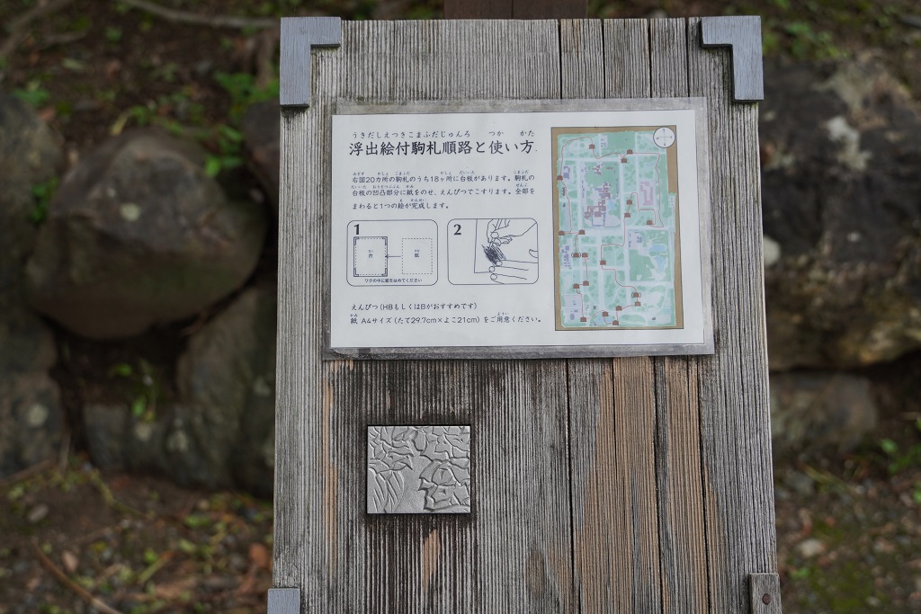 また、苑内20カ所に駒札型の歴史解説版が設置されていて、そのうち18基で浮出絵が楽しめます。解説版の手前に付けられた台板の凸凹部分に紙をのせて、鉛筆でこすると絵が浮き出てきます。全部回ると1つの絵ができ上がり、どの駒札からはじめても完成します。台板に浮出絵付き駒札の順路と使い方が表示されているので、A4サイズの紙と鉛筆を持参して探してみてくださいね。