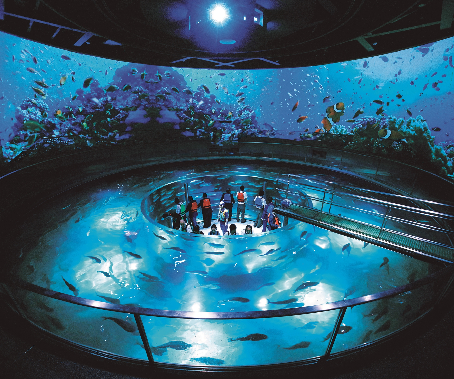 「コーラルリーフ・ダイビング」では、世界初の全面ガラス張りの観覧ギャラリーが設けられ、カラフルな熱帯魚やウミガメ、色鮮やかなサンゴ礁の海をダイバー気分で観賞できます。