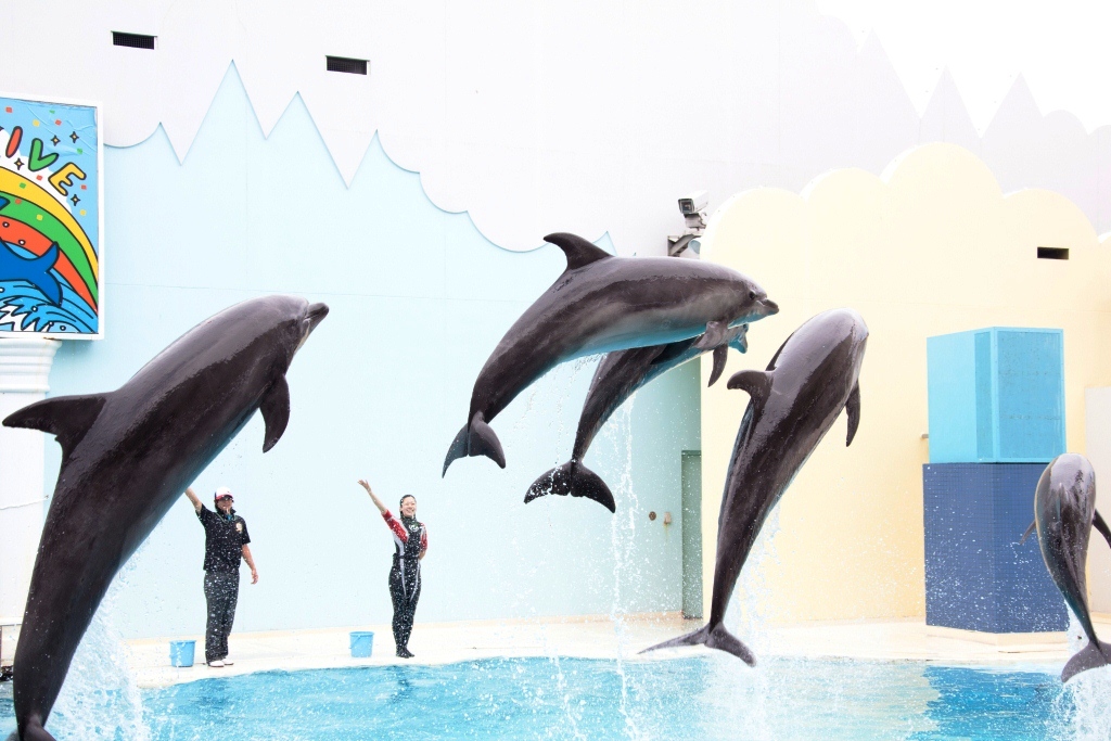 アドベンチャーワールドには、バンドウイルカやオキゴンドウ、カマイルカたちのスピーディーでダイナミックなパフォーマンスを楽しめる「マリンライブ」の会場があり、すぐ目の前でトレーナーとの息の合ったショーを見せてくれます。