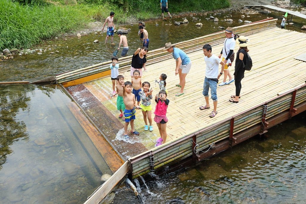 小さな子ども連れの家族には、男川(おとがわ)やなでのアユのつかみ取り体験がおすすめ。男川やなでは、5月上旬頃から11月中旬頃まで「やな」でアユのつかみ取りを実施しています(つかみどり生コース1750円・アユ3匹)。「やな」とは、河川に木や竹でできた足場を上流に傾けて設置し、上流から下流に向かって泳ぐアユを捕獲する仕掛けのこと。川の中に入ることなくヤナの上でアユを獲るため、川の中の石で滑ってケガをするなどの心配が少ないのです。2~3歳の子どもでも安全にアユのつかみ取りにチャレンジできます(必ず大人と一緒にやりましょう)。