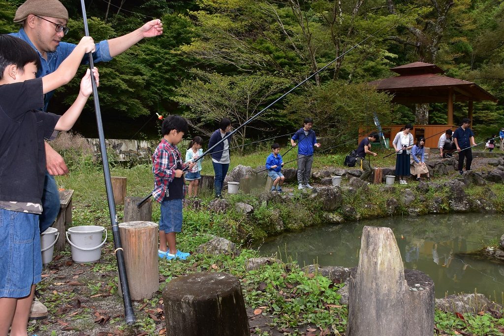 6面ある釣り池では、ヤマメ釣りの体験ができます。竿やエサは用意されているため(料金込)、荷物が少なく済むのもポイント。初心者でも楽しめるようにスタッフさんがアドバイスをしてくれたり、仕掛けも用意されているので安心です。