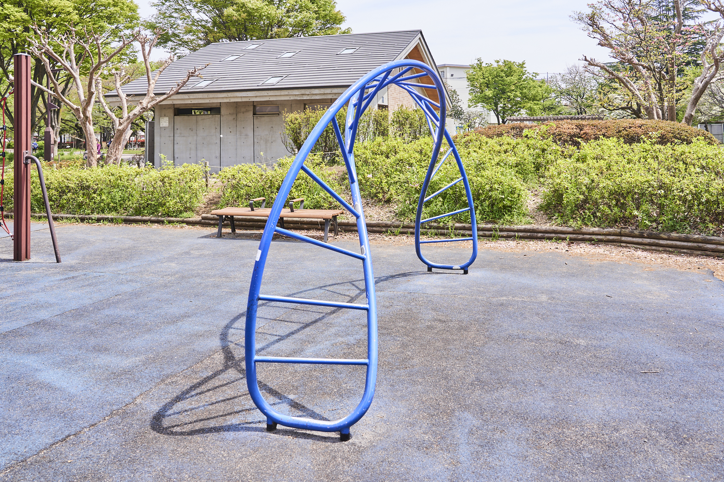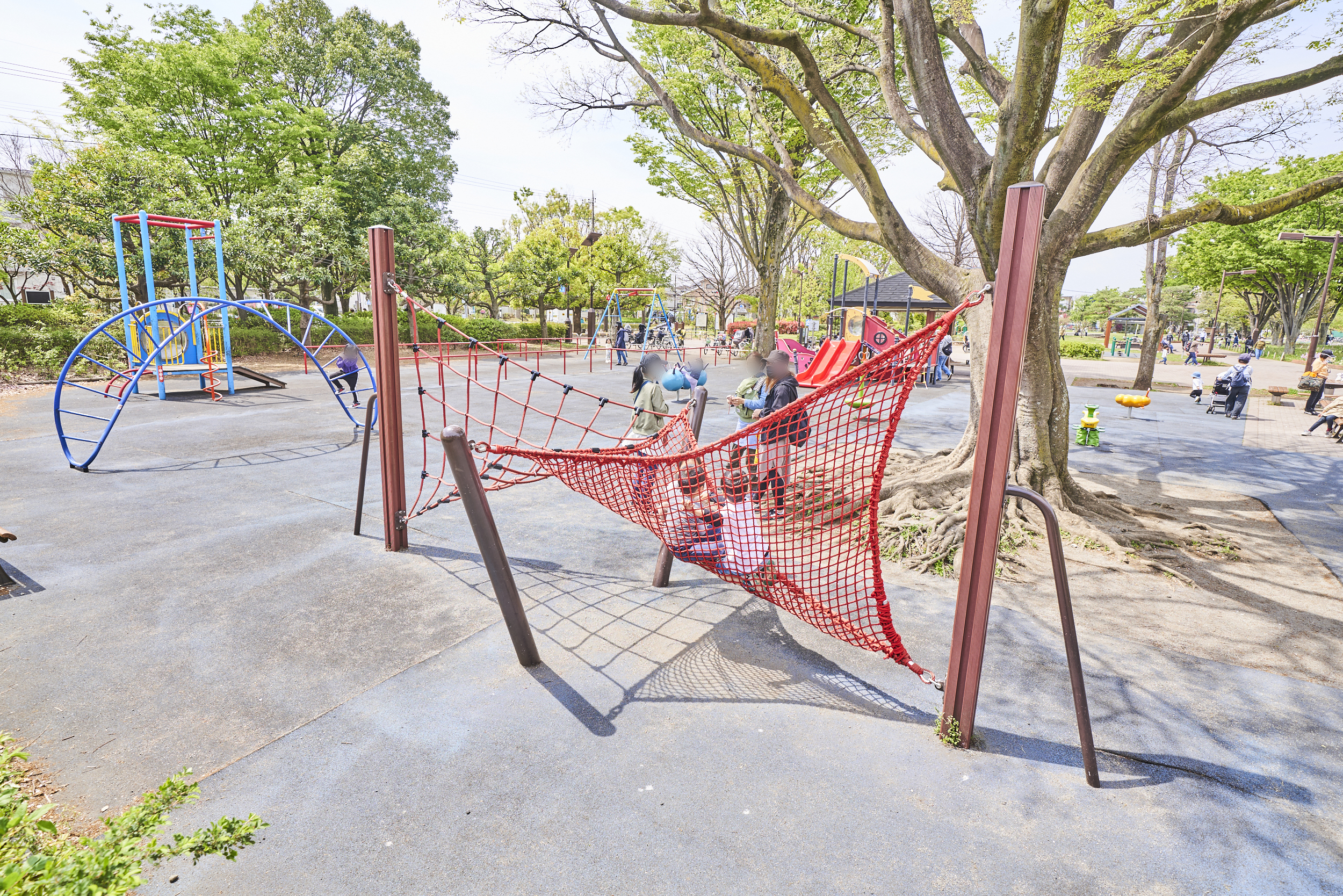 「遊具広場」はコンパクトながら、土日・平日を問わず多くの親子で賑わうスポット。3~6歳向けの遊具が多く、小学生のお兄さん・お姉さんが年少の子どもにやり方を教えている微笑ましい光景もよく見られます。地面がクッション性のある素材で舗装されており、転んでもケガをしにくいよう配慮されているので小さな子どもも安心。広場の脇に屋根付きの休憩所があるのも便利です。