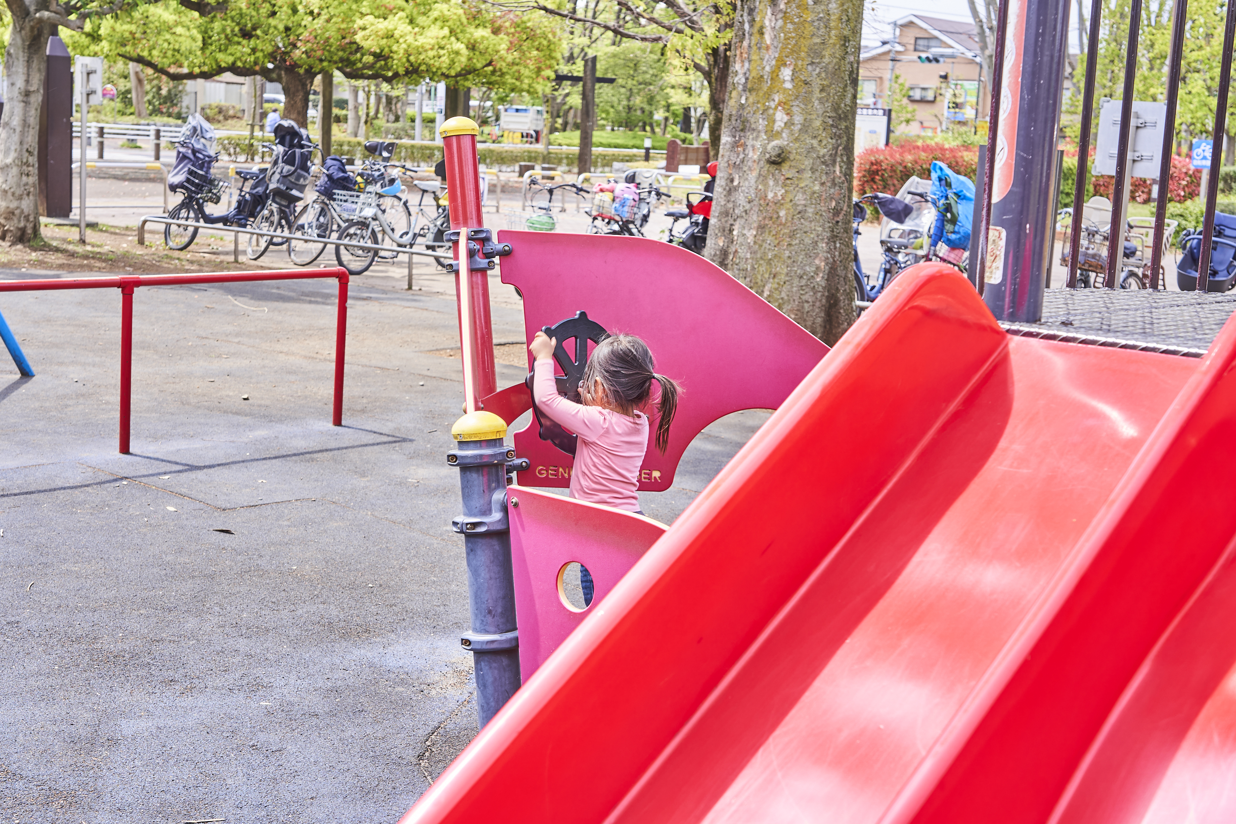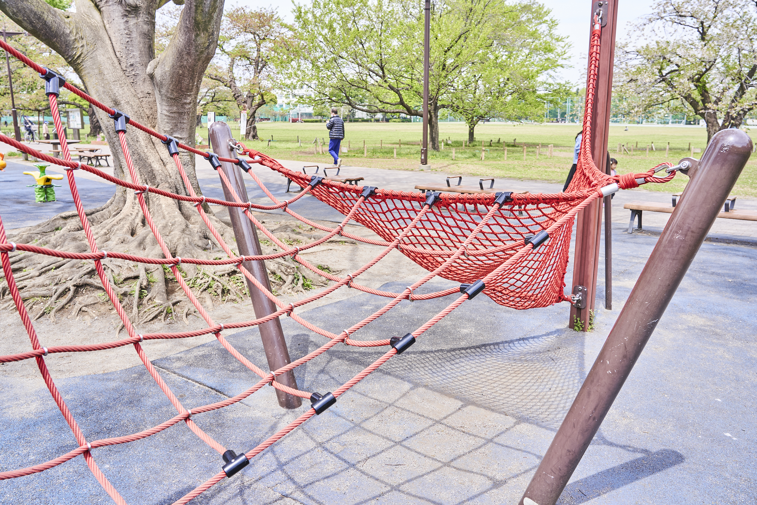 滑り台のほかに、ターザンロープやネット遊具、幼児用の小さいシーソー、回転遊具などがあります。物足りない小学生は、隣の「健康遊具広場」にも行ってみるといいかもしれません。子どもが楽しめそうなものもありますよ。