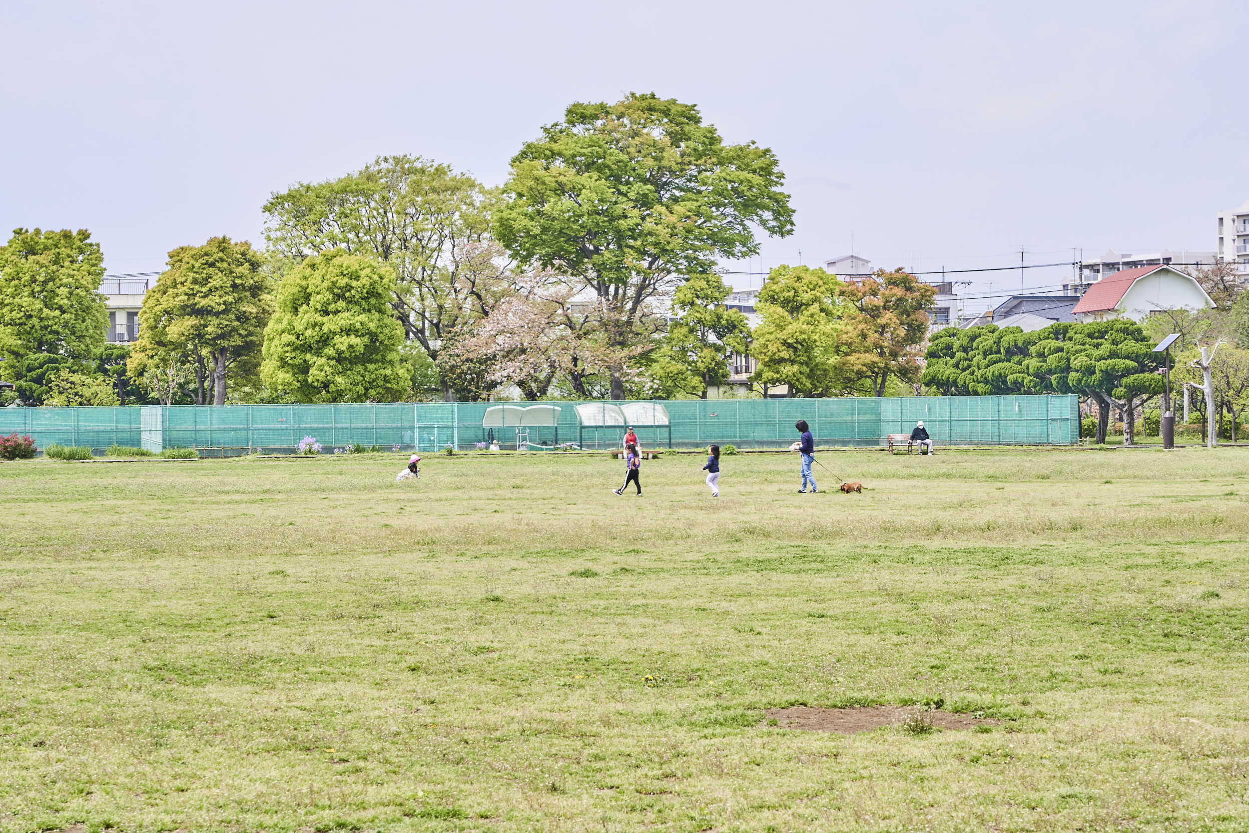 公園中央の「原っぱ広場」には、ヨガをしたり、犬の散歩をしたり、思い思いに過ごす近隣住民の姿があります。視界を遮るものがなく、とっても開放的。空が大きく感じられ、凧揚げや紙飛行機などのイベントが行われることもあるというのも納得です。ボールやフリスビーなどの道具を使って遊ぶこともできるので、準備をしていくと一層広々とした空間が満喫できますよ。