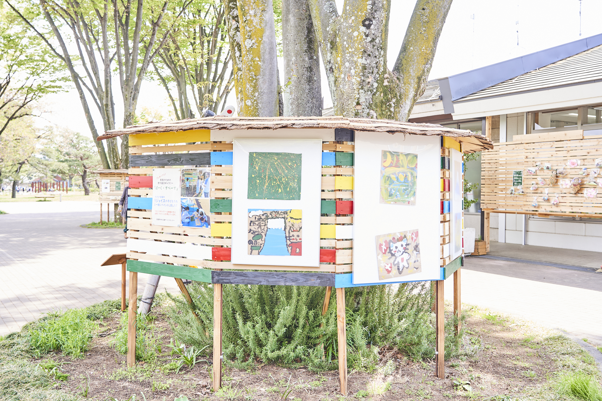 公園サービスセンターの前に、子どもの工作や絵が飾られた「野外ギャラリー」が設けられています。見て楽しいのはもちろん、木の実や小枝など公園で見つかる自然素材を使った作品もあり、公園遊びのヒントがもらえそう。