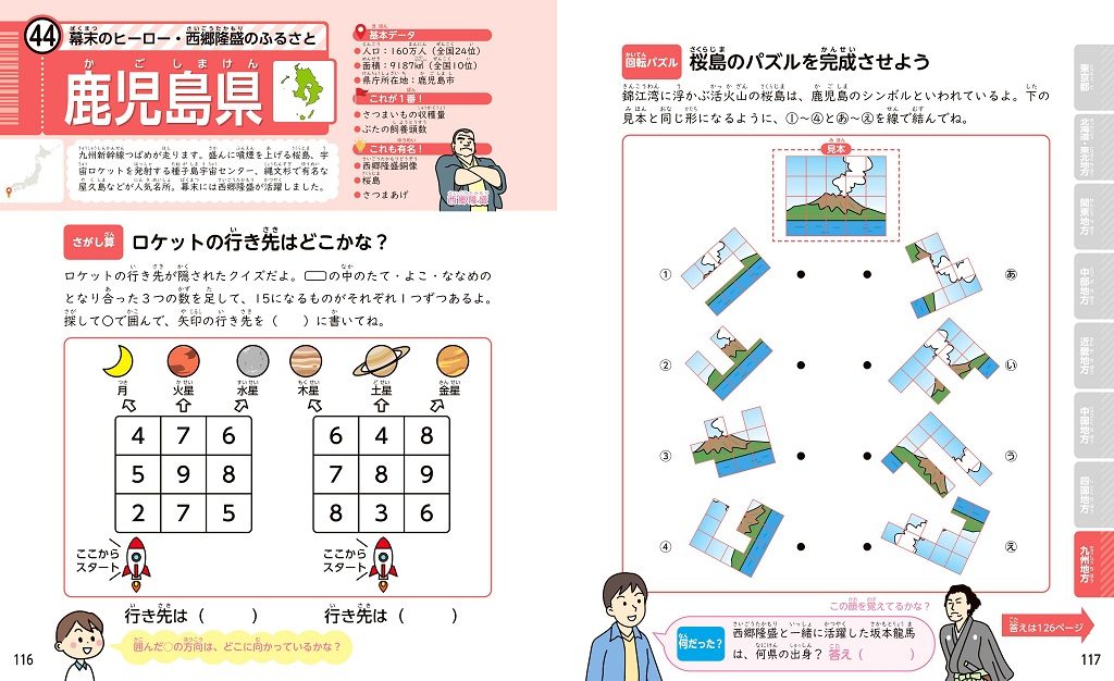 こどもにも大人にも楽しい問題がいっぱいです。なじみのある全国の名所や名物を使っているので、「ここに行ったね!」「次はここに行きたいね」などの会話が増えます。こどもといっしょに勉強しているとイライラしちゃって…というママやパパも楽しく取り組めます。