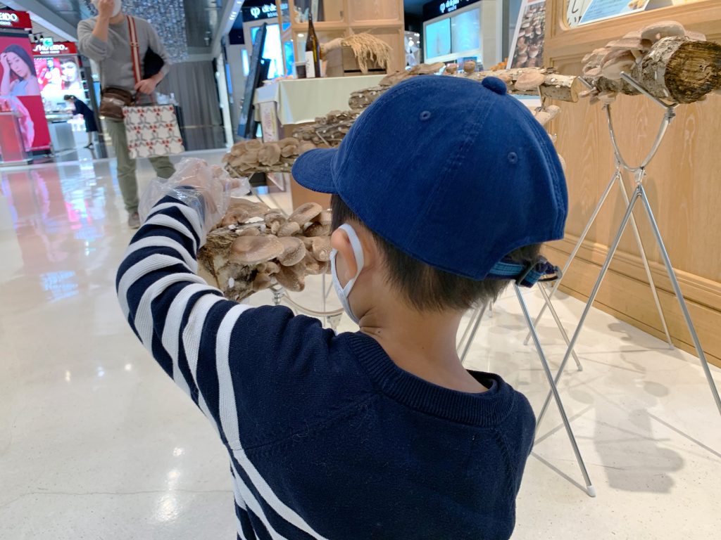 洲本市でしいたけ農家を営む奥田製作所が、60年かけて開発した原木しいたけを設置。期間中の土・日曜の午後に、淡路島・洲本市フェアにて3,000円以上購入した方限定で、原木からのしいたけ狩りを体験できます。