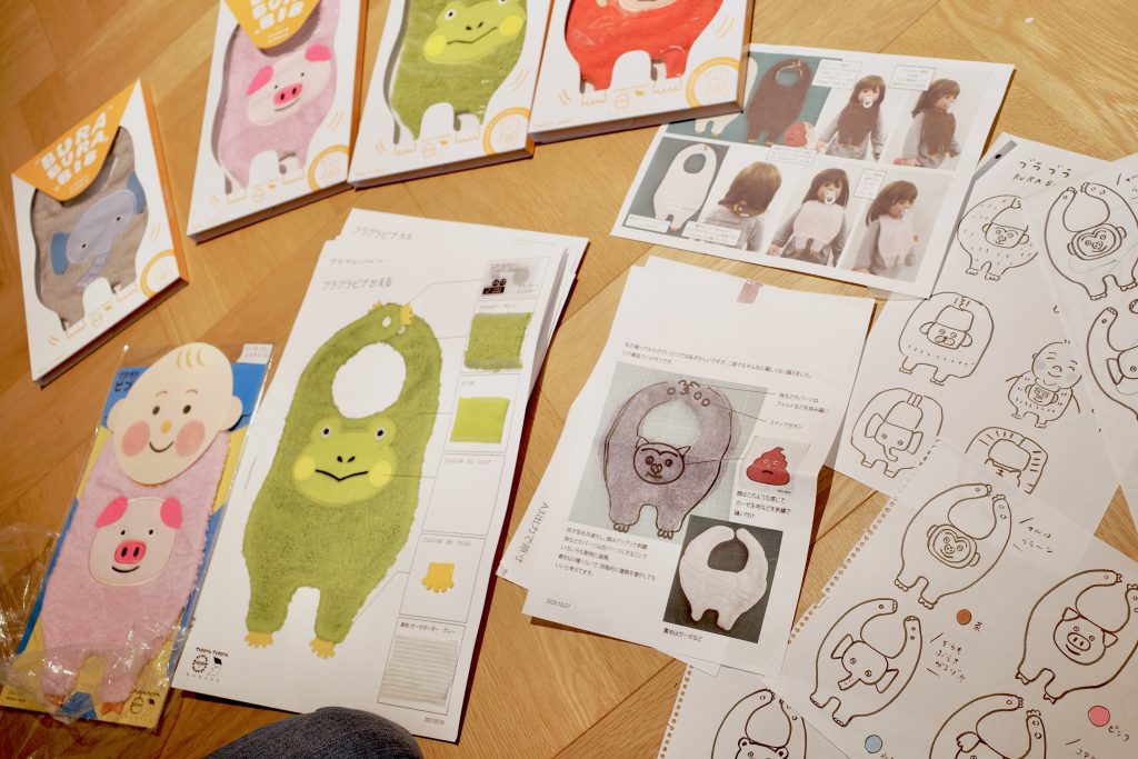 中川:これはタオルメーカーのコンテックスさんと一緒につくった「ブラブラビブ」という商品です。右にあるラフスケッチをもとにデザインを進め、試作してもらったのが左下で。パッケージに赤ちゃんの顔がついていると、商品の動物に目がいかなくなってしまうということで、最終的には左上のものになりました。
