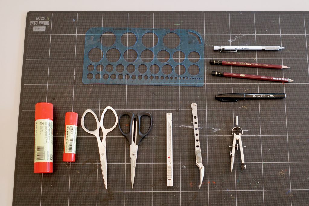 下に敷いてあるのがカッターマット、下段左からスティックのり、亀山さんのハサミ、中川さんのハサミ、カッター、ピンセット、コンパス、上段左から丸を描く定規、シャープペンシル、鉛筆、サインペン。