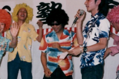 予備校の芸術祭で、友人たちと出し物をやったときの亀山さん(中央)と中川さん(左)。