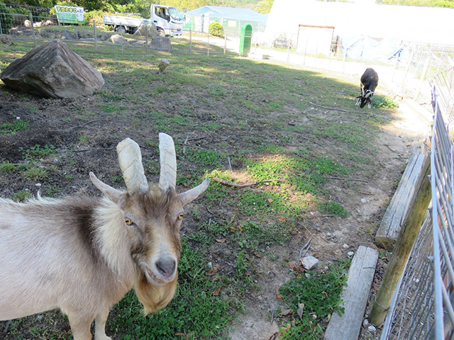 フラワーパークとにわとりの庭の間には、ヤギ牧場があります。ヤギのおやつは100円(自動販売機)。