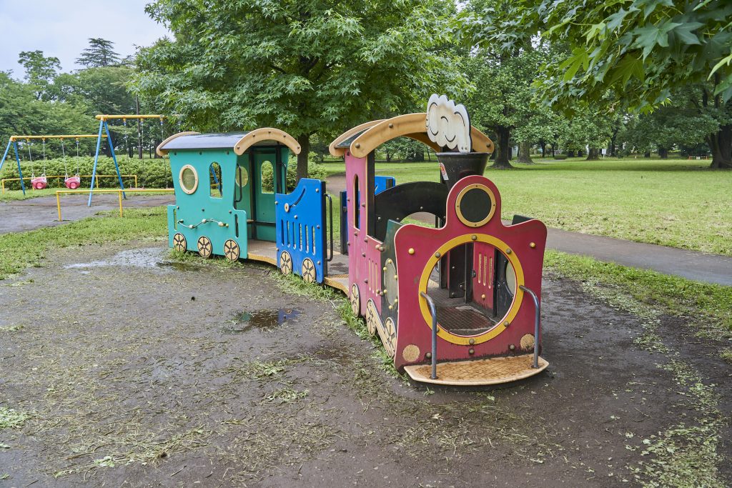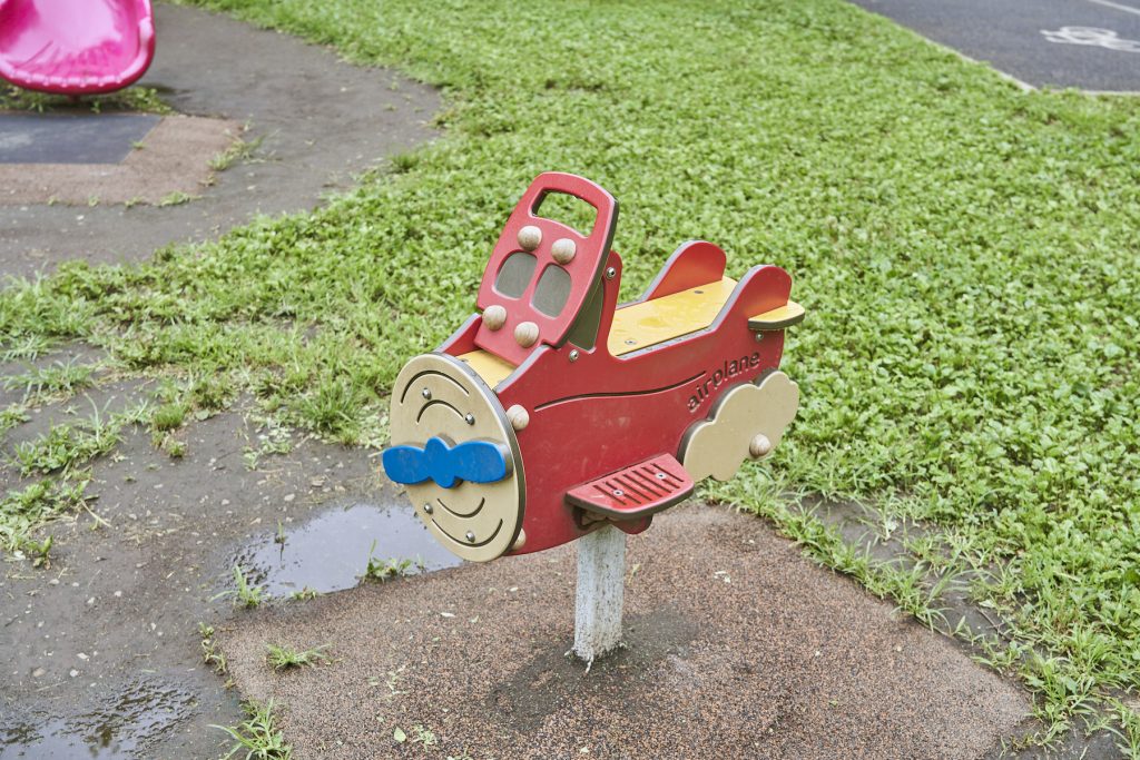 東口の近くにある「桜堤なかよし広場」も幼児向け遊具がある広場。カラフルでかわいい遊具のなかでも目を引くのが、乗り物の形をした遊具です。