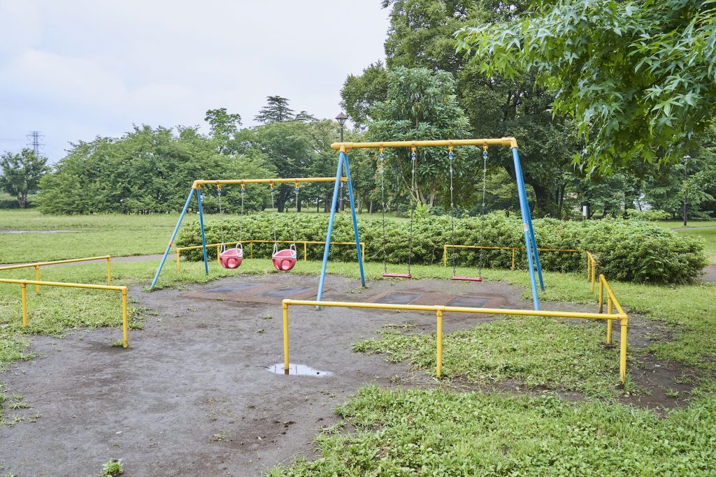 西口の近くにある「桜の園なかよし広場」は幼児向けの広場。ブランコ、すべり台、スプリング遊具、砂場が置かれています。