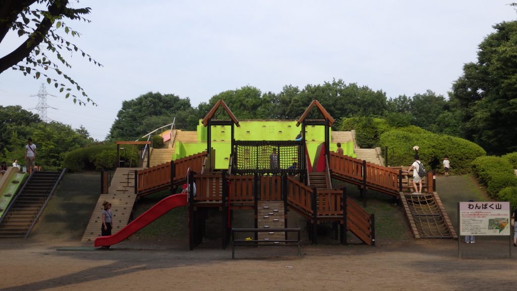 さまざまな遊具が集まった「わんぱく広場」。なかでも存在感があるのが傾斜を生かして大小のすべり台、クライミングロープ、ボルダリングウォール、丸太渡りなどを組み合わせた複合遊具のわんぱく山です。上に上れば広場全体を見渡すことができますよ。