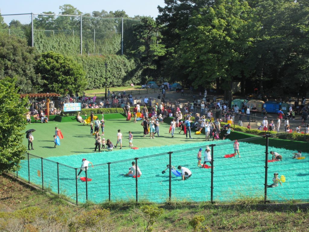 小金井公園には大型の遊具があり、子どもたちの人気を集めています。ひとつは富士見の丘にある「ソリゲレンデ」。7.2mの高さから最大斜度17度の人工芝の斜面をソリで滑り降りる遊具です。持参したソリを使って遊びましょう。