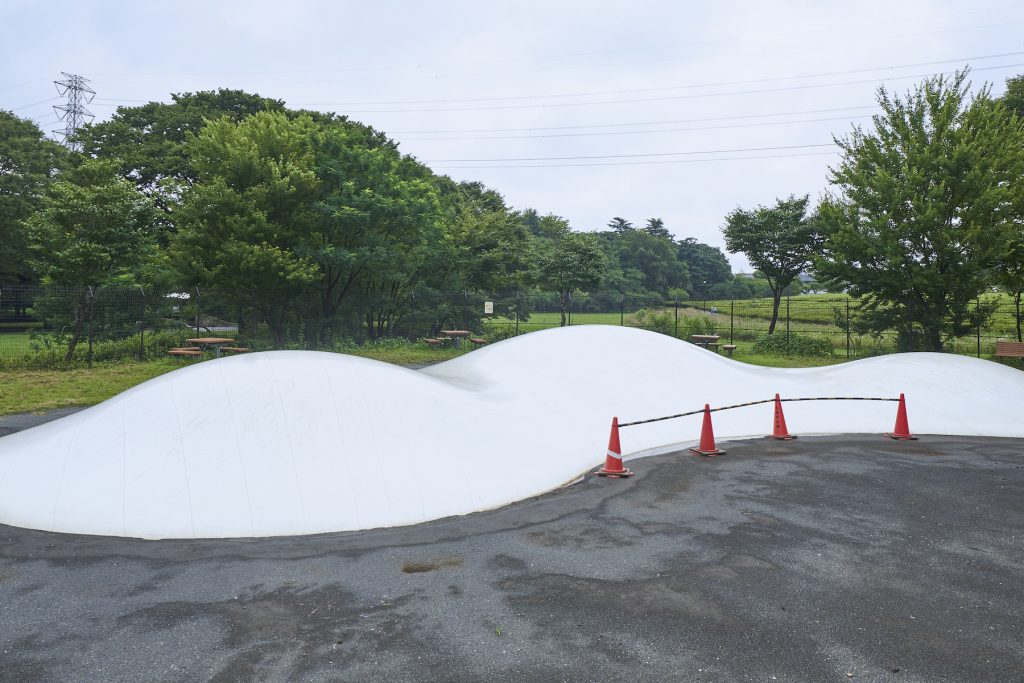 もうひとつは、つつじ山広場にある「ふわふわドーム」。ぴょんぴょん飛び跳ねて遊ぶ、大きな膜を膨らませた山形のトランポリン遊具です。