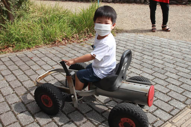 小学生以下の子ども対象の足こぎ四輪車で、左右のレバーがハンドルになっています。左側のグラウンド・ゴルフ通路の折り返し地点までの往復コースを走れます。