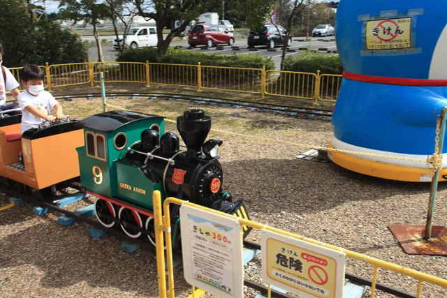 「改善センター」右側にある硬貨式の「きしゃ」や、田園資料館右手前にある硬貨式の「アンパンマンSL」(3周300円、定員:大人2名・子ども2名)も人気です。