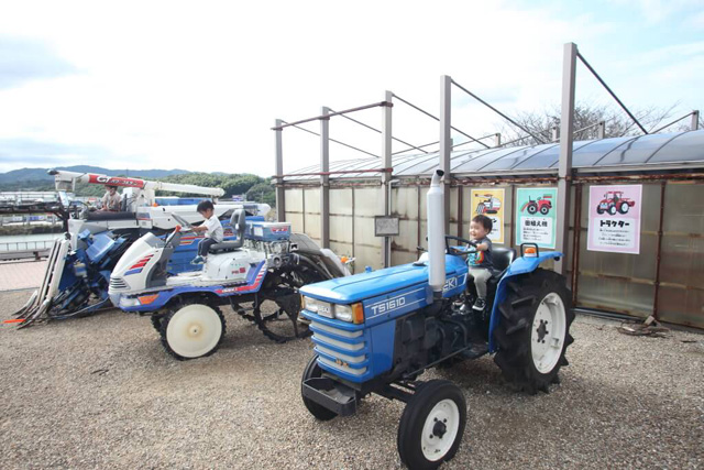 田園資料館とデッキテラスの間には大型農機具のコンバインと田植え機、トラクターが置いてあり、自由に子どもを乗せて記念写真を撮ることができます(無料)。