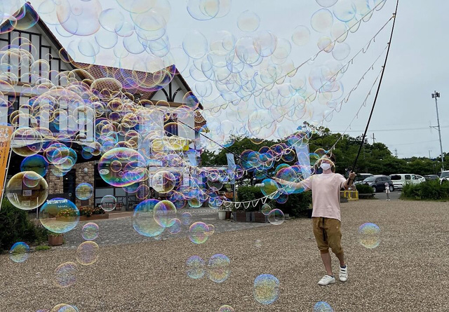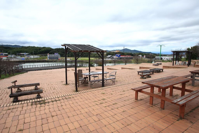 直売所「ドラゴンちゃん」から池側につながるデッキテラスのテーブル・椅子を利用したり、レジャーシートを広げて、持ち込みのお弁当や直売所で購入したテイクアウトフードを楽しめます。週末やGW、夏休みなどには池側にある水上ステージで、ショーやイベントなどが行われることも。