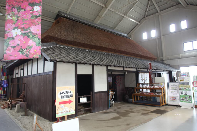駐車場から敷地に入った正面にある田園資料館(入館無料)には、茅葺屋根の古民家や農具、近江牛に関する資料が展示されているほか、お弁当やおやつが食べられる休憩コーナー、キッズコーナー、授乳室、売店などがあります。古民家では、中に入って昔のおもちゃで遊ぶこともできます。どこか懐かしさを感じる家に遊びにきたかのようです。