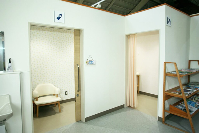 田園資料館に入って左手に授乳室とおむつ替え室があります。それぞれ独立した部屋なので、パパだけでもおむつ替え部屋に入ることができます。授乳室利用の際は、入口のプレートを「使用中」に裏返してください(スタッフへの声かけ不要)。おむつ替え室には、使用済みおむつ入れが備えられています。