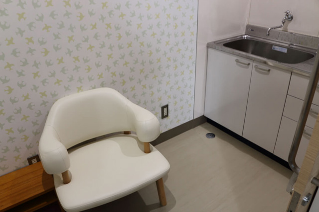授乳室には椅子と流し台があります。ミルク用のお湯が必要な場合は事務所スタッフに相談してください。