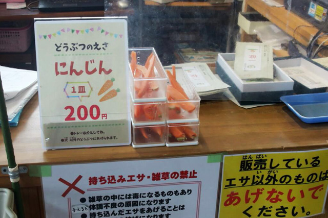 えさ(にんじん細切り×約6本)は、入口受付にて1皿200円で販売しています。広場に入る前に購入しておくのがおすすめです。