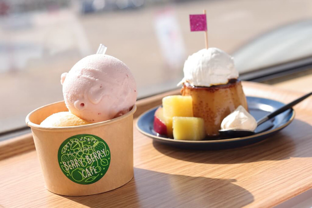 改善センター1階の右側入口を入ると、人気のジェラートやパフェなどのスイーツが楽しめる「Berryberry cafe」があります。1階の椅子席やテラス席、2階ホールで味わえます。