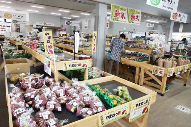 駐車場スペースの左手正面にある産地直売所「ドラゴンちゃん」では、地元農家の新鮮な野菜や果物をはじめ、お米、お弁当や特産品、オリジナル商品などが販売されています。パン工房やイートインスペースもあり、のんびりお買い物ができます。