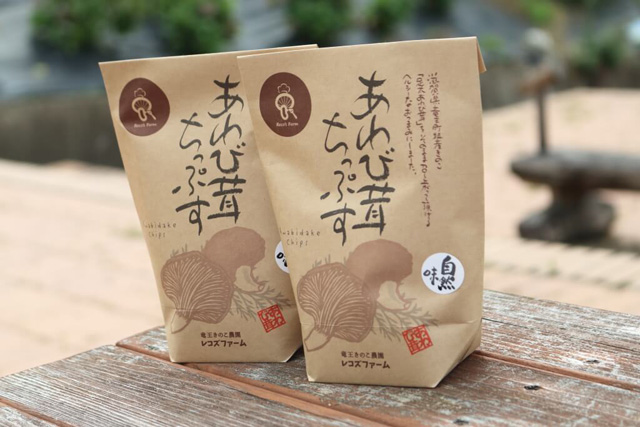 竜王町特産きのこの「足太あわび茸」がそのままチップスに。ヘルシーでローカロリーなスナックです(写真は自然味、ほかに塩味、醤油味あり)。