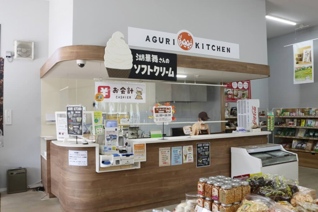 イートインスペースを備えた「アグリキッチン」は、お買い物途中で休憩するのにぴったり。地元牧場の搾りたて牛乳100%のソフトクリーム(350円)やドリンク(100円~)が購入できます。