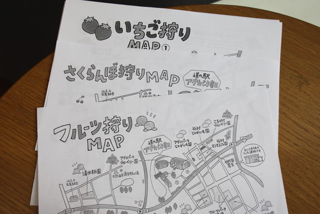 指定された農園までの地図を受け取ります。食べごろの時期に合わせて畑を指定されるため、複数の品種があるフルーツでも品種の指定などはできません。徒歩で行ける近隣の農園もありますが多くは車での移動となります。施設での送迎はないので、マイカーやレンタカーで訪れるのがベスト。
