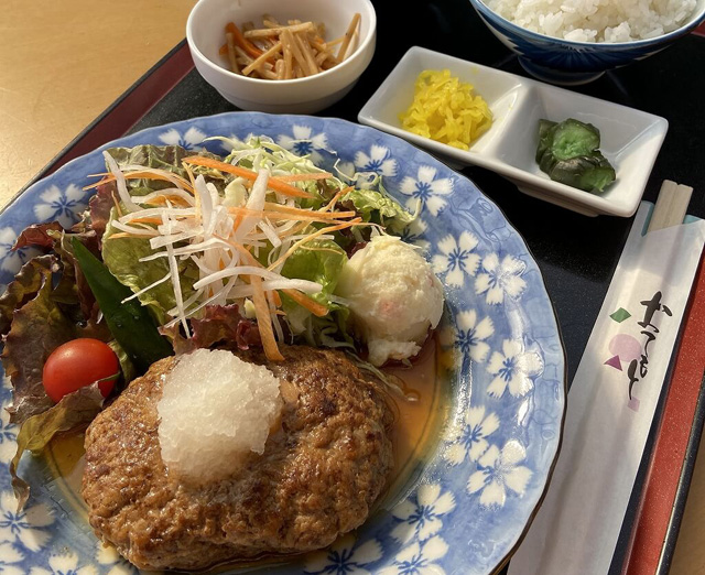 近江牛がたっぷり入った自家製ハンバーグ定食。写真の和風(おろしポン酢ソース)のほかデミグラスソースもあります。